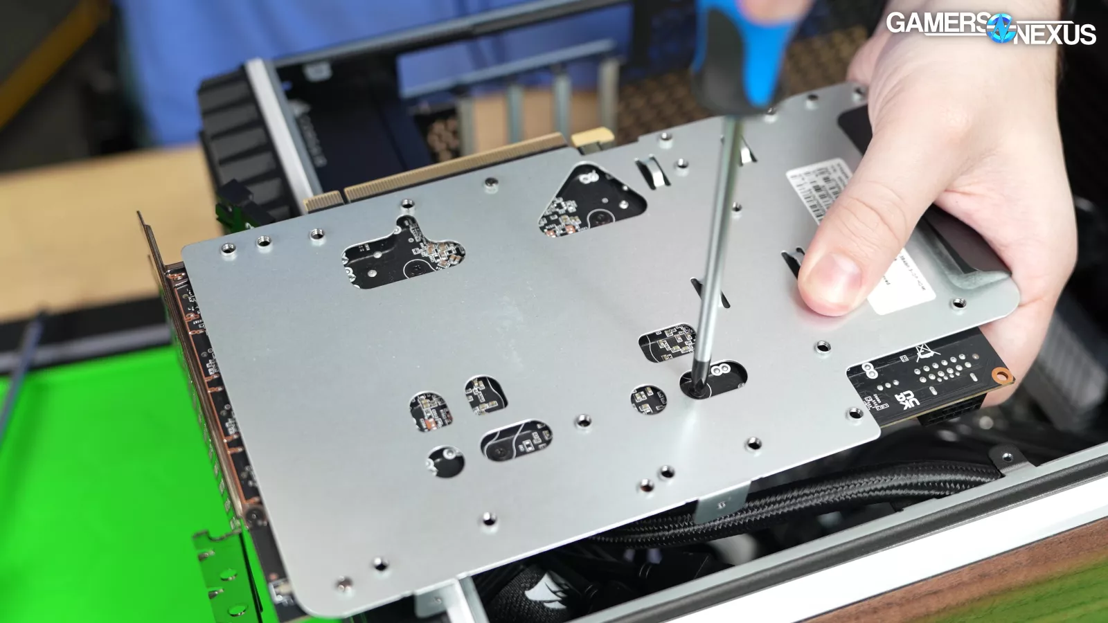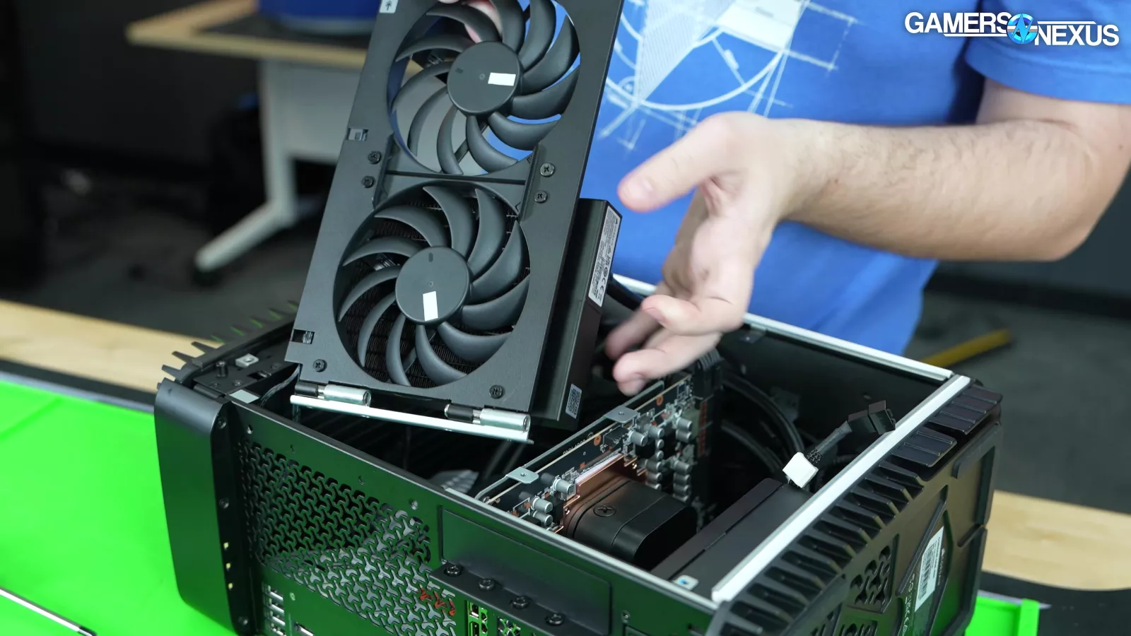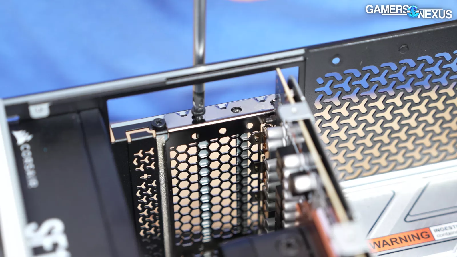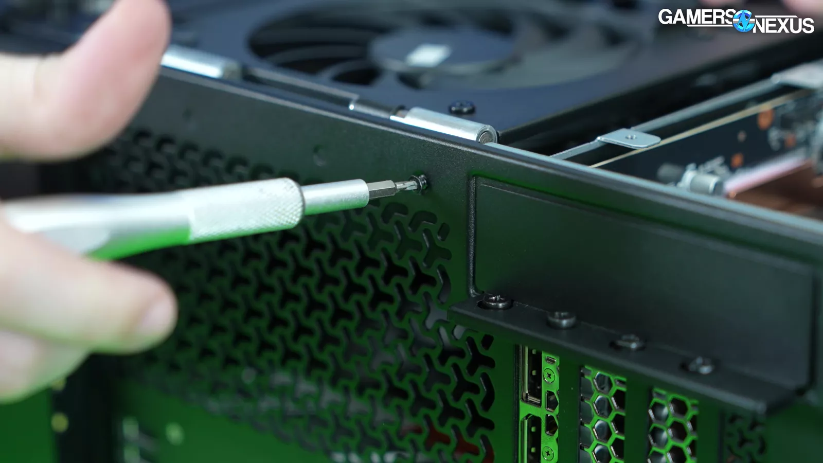Opening the bottom fan hinge, this air will mostly hit the exposed GPU components. Because the upper half of the chassis is sectioned-off by the card and because there’s a solid steel plate next to it, most of the air finds its way out through the rear PCIe slot covers. There’s a ton of heat in this area from the PCB and GPU and no active way to get rid of it, plus the card is dividing the case, so a lot of the heat will get trapped and pool around the video card. We think this contributes to a lot of the problems.