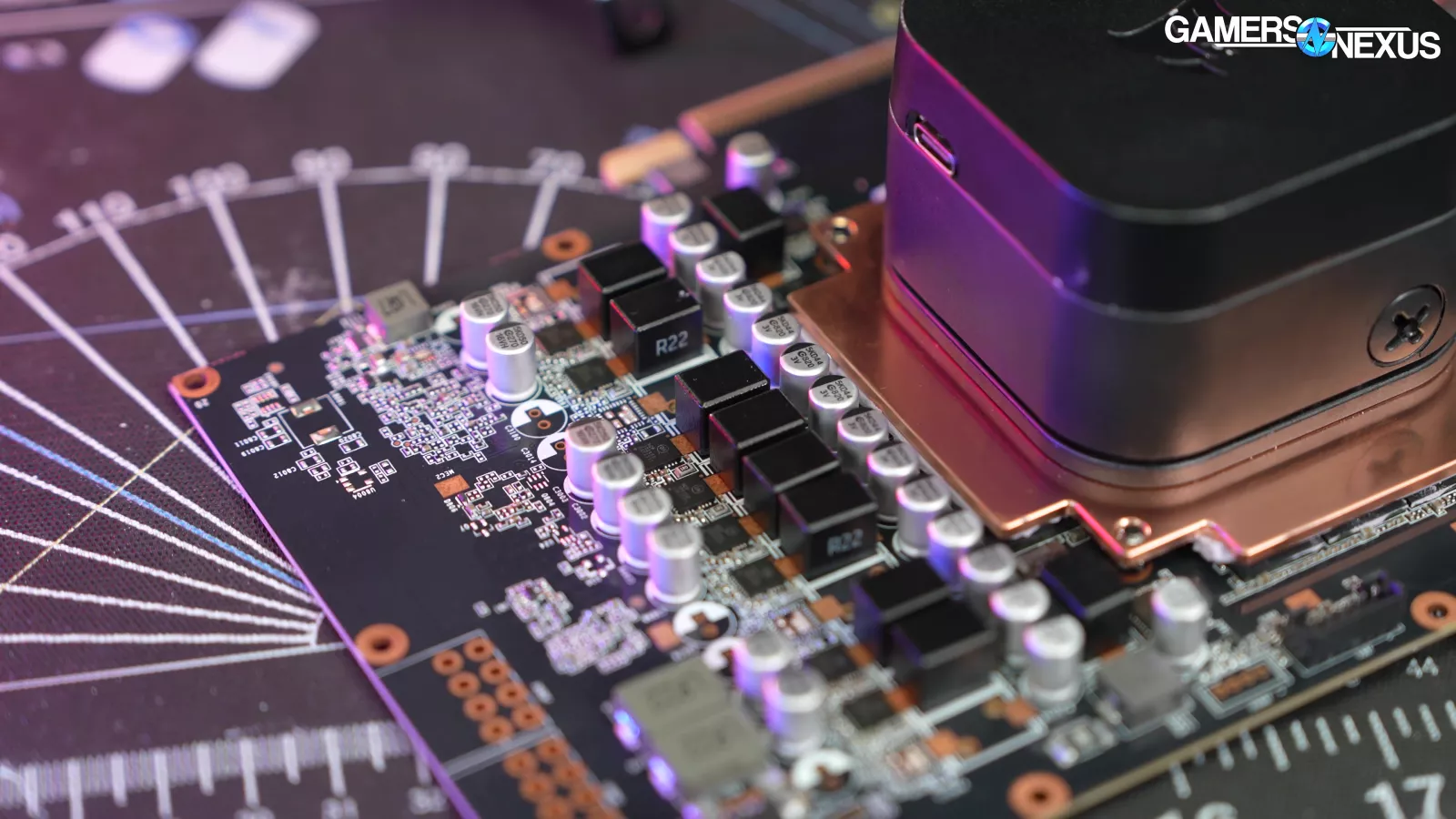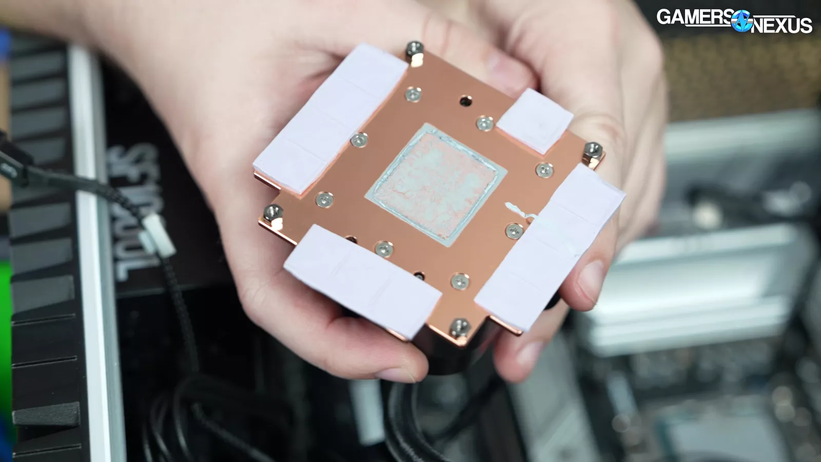 We looked at the space between the PCB and the copper cold plate to check for thermal pads and saw that a corner of the memory module had zero contact to a thermal pad. We also saw poor contact around the edges of other memory modules. This helps explain some of the poor performance we saw in our thermal results.