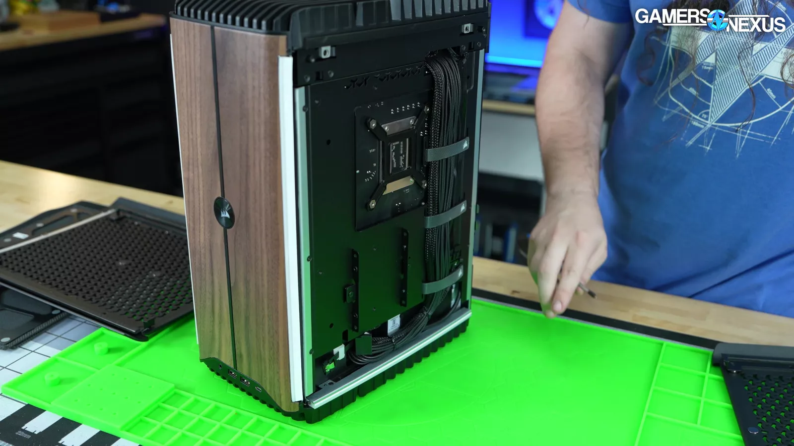 3 fans are revealed from removing the left panel. Some of these are on a hinging mechanism that we actually liked, if not for all the other problems. It’s a good way to get side intake without the panel itself being tethered to a cable. Opening the hinged door reveals the top exhaust fans mounted to the GPU radiator, with one fan attached to CPU liquid temperature.