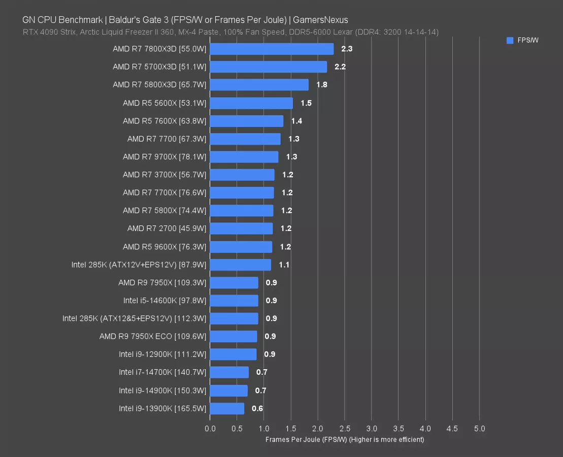 The 285K and 14900K ATX12V remains from last time. The 7800X3D was pulling about 12W ATX12V fixed during this test and didn’t seem to fluctuate based on load at all. It appears fairly isolated. Typically, this gap of 10W comes out in the wash when you’re talking a 280W 14900K versus an 80W 7800X3D, so it’s just part of the usual margins. In this scenario, however, the difference against the 285K really starts to show.