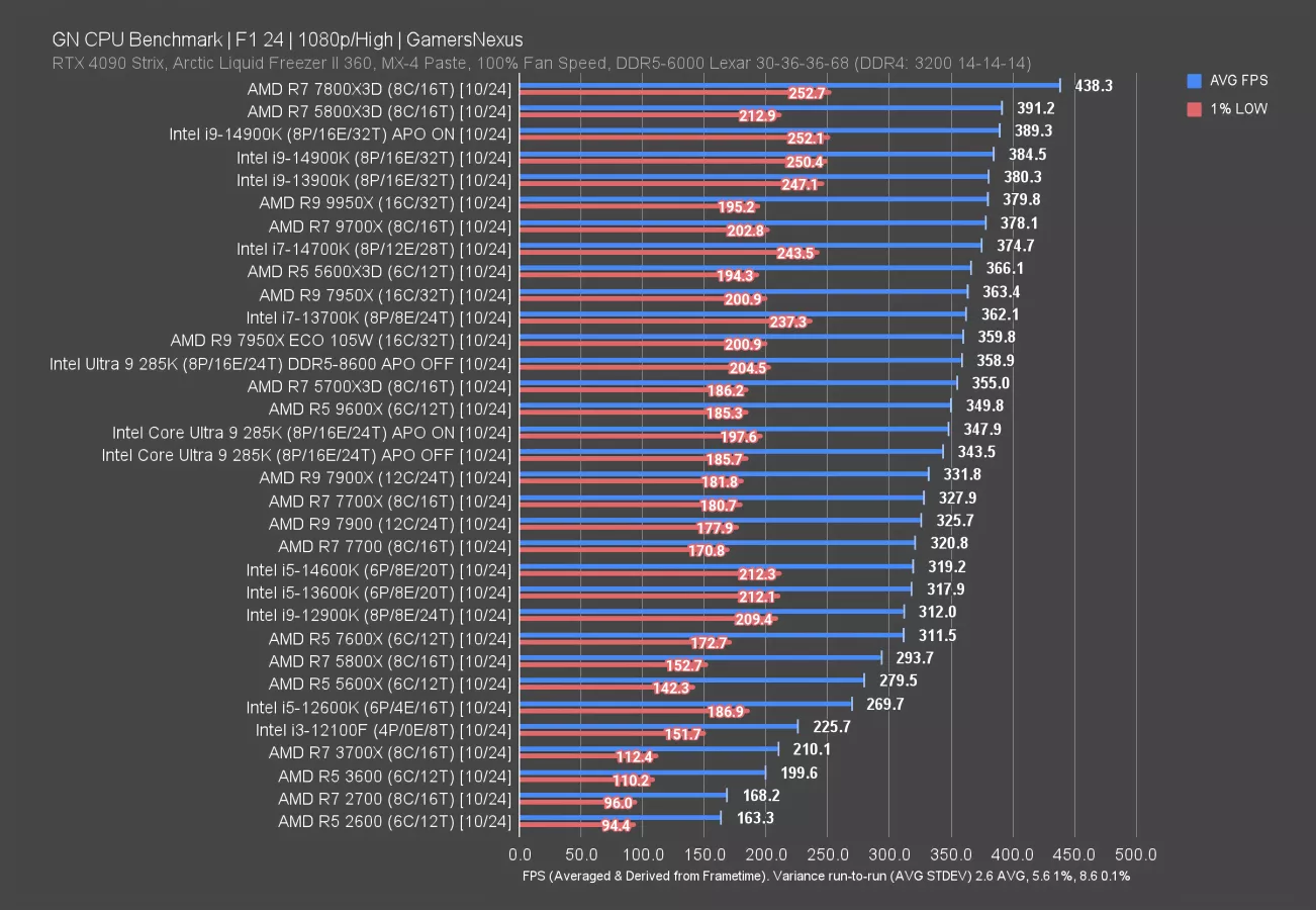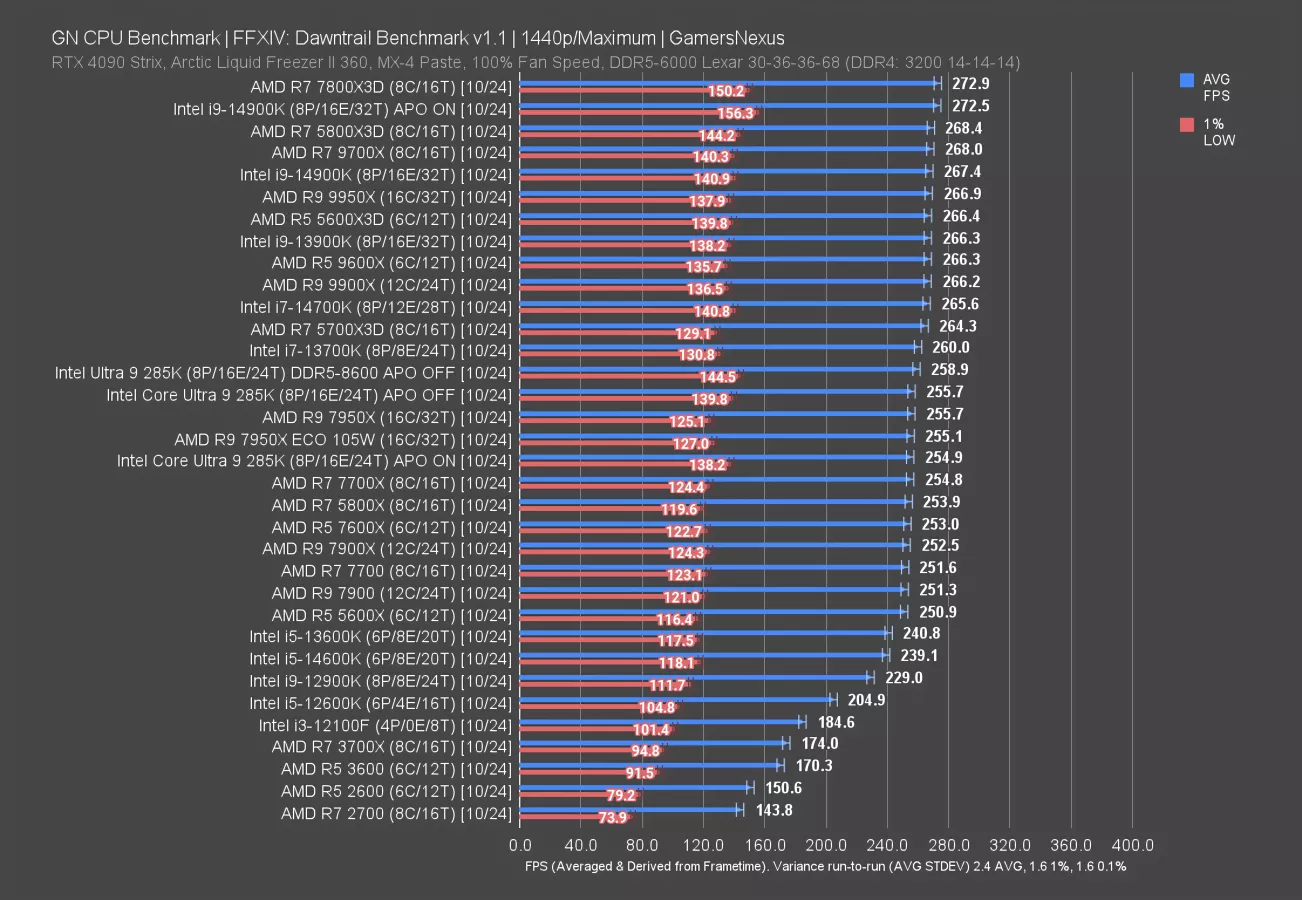 The 7800X3D establishes a 26% lead over the 285K, at 126 FPS to 100 FPS AVG. The 14900K leads the 285K by 4.5%, at about 105 FPS AVG.
