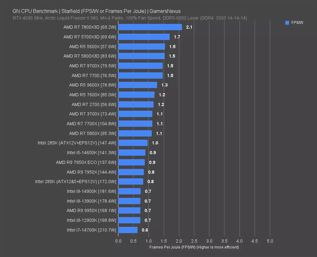 If your power costs $0.10/kWh like ours, then you’d need to play the highest CPU load games for 8 hours a day for an entire year in order to gain $19 of value in power bill reductions for the 285K against the 14700K. At $0.15, the shut-in gaming levels would give the 285K a savings of $30 over one year of literally playing Starfield or Cyberpunk as a full-time job. At the peak of degeneracy that we all strive to achieve, you’d have to play games at this pace for 10 years to have spent more on power than the cost savings of buying the cheaper CPU (it’s the delta, not total cost). Maybe throw in a cheaper cooler as well since power is down and call it 8 years.