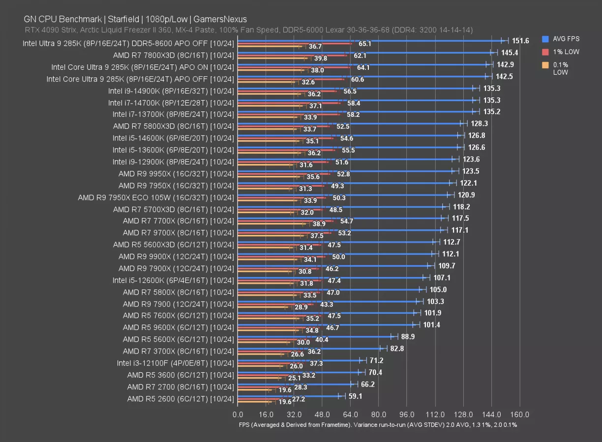 In Starfield, another 2023 game, the 7800X3D maintains a 2% advantage over the 285K, at 145.4 to 142.5 FPS AVG. We’re bound elsewhere -- and that elsewhere is obvious: The DDR5-8600 result jumps to the top of the chart, illustrating that at least some of our limit is memory. As a reminder, applying the memory tuning treatment to everything would boost all numbers, so looking at baseline will give you an idea for their headroom.
