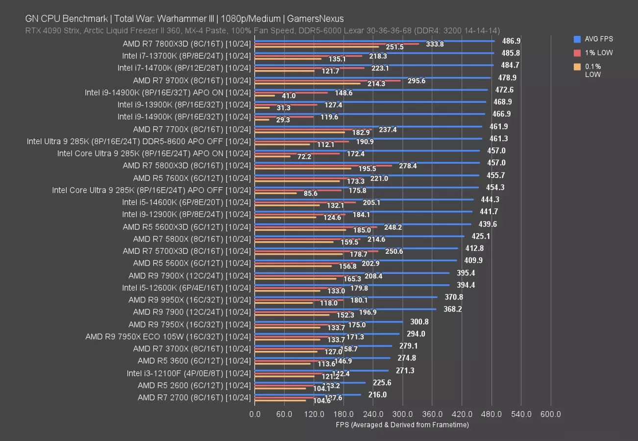 Total War: Warhammer 3 is up now. The 7800X3D led the 285K by 7.2%, with the 14900K leading by 2.8%. Total Warhammer 3 is on the APO list, so it’s supported. On the 14900K, we saw an uplift of about 1.2%. On the 285K, we measured an improvement of 0.6% -- basically error.