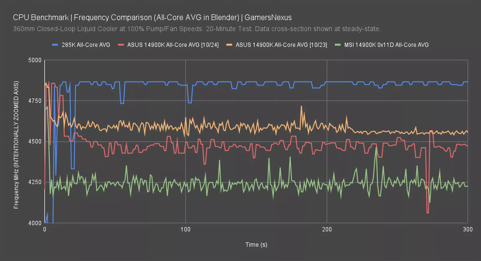 The 285K maintains an average P-core frequency of 5400MHz in this testing. It’s relatively flat. That has it higher than the 2024 ASUS test entry, which is what we used for our review comparison today, at around 5100-5220MHz. The 2023 launch entry was higher, at 5280-5400MHz on average. The microcode changes may have affected this since launch. The MSI 0x11D microcode entry had the CPU at around 5000MHz from the same window as the ASUS 2023 entry. The most up-to-date frequency entry sits between the two flanks of early 14900K tests.