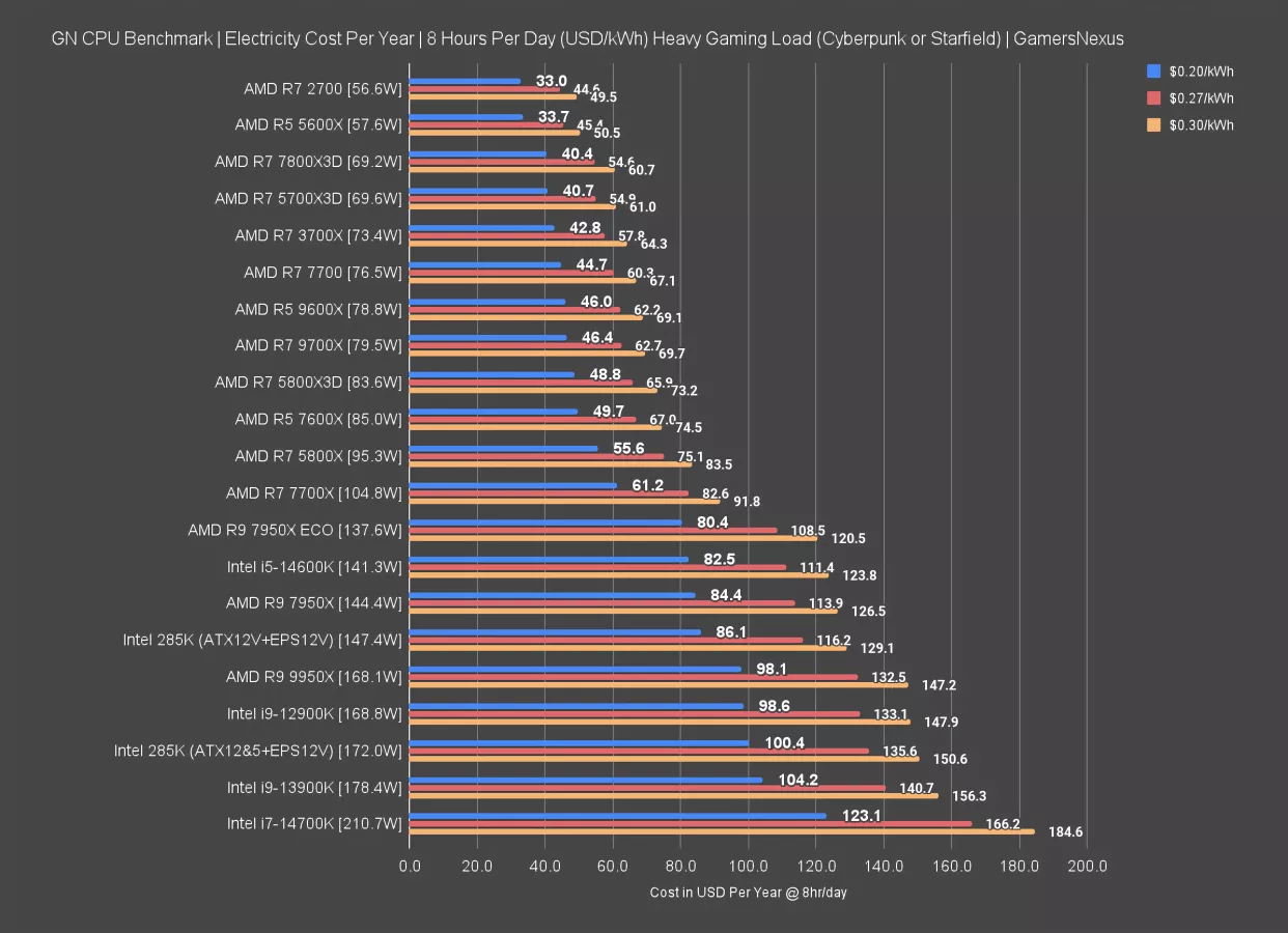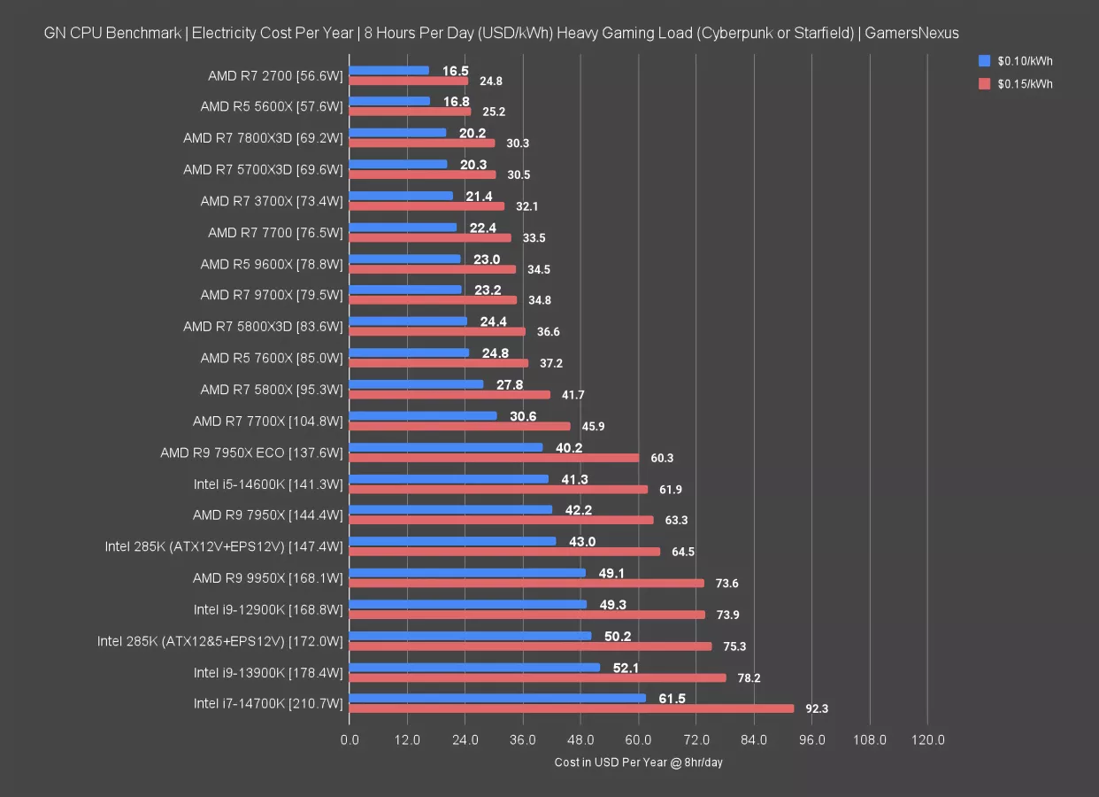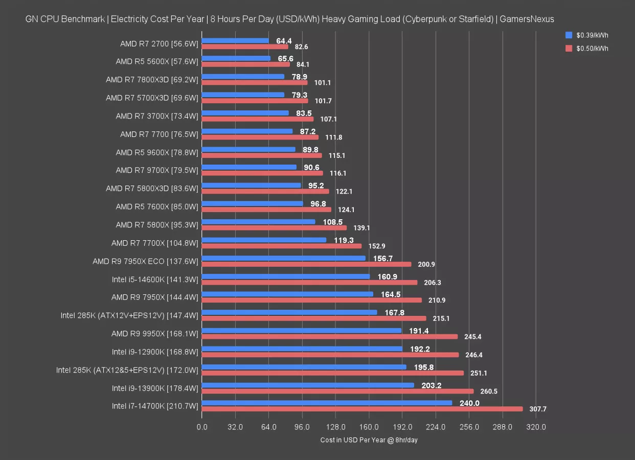 Let’s just say you pay $0.50/kWh. In one standard 3-year upgrade cycle, you can save the amount of money in power you’d save buying the 14700K -- which we still don’t recommend for gaming -- rather than the 285K. That’d be a savings of $92.60 per year (at $307.7 - $215.1).