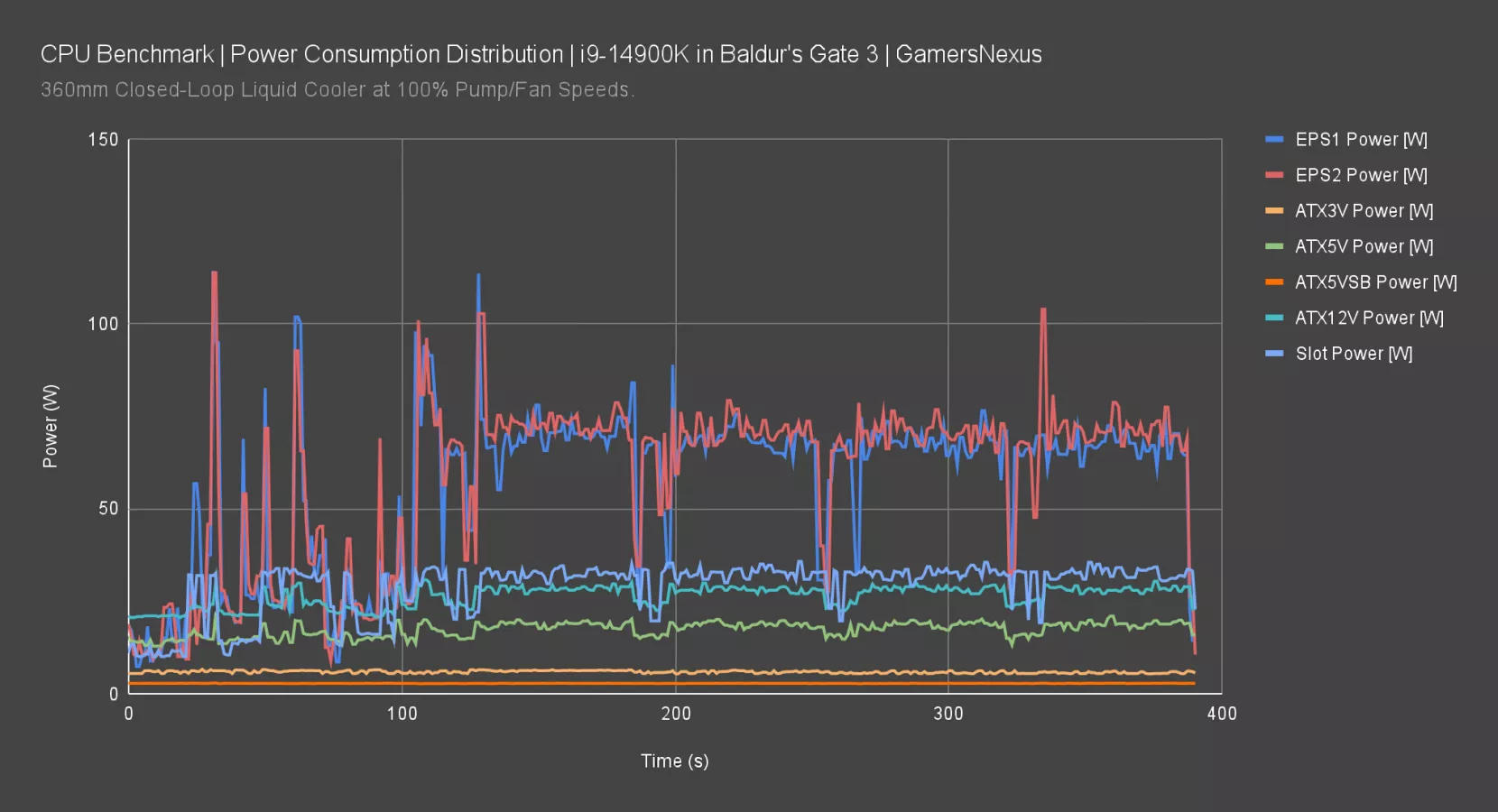 Proving our work: This plot shows the 14900K’s power draw in a known workload spread across multiple rails. You can see that EPS1 and EPS2 power is similar, both at around 70-80W in this lighter weight gaming workload. The 24-pin has several voltages, including 3.3V, 5V, 5VSB, and 12V shown here.