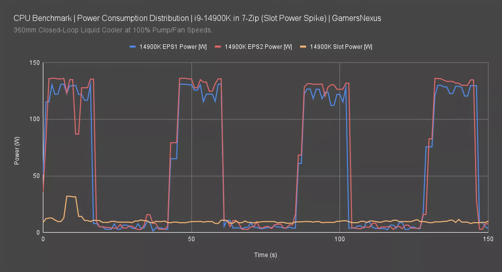 Here’s why we isolate slot power: This benchmark was for 7-Zip on the 14900K. The GPU does literally nothing in this test except spit out the display. It does not engage in the test. However, occasionally in any test, we measure seemingly random spikes to slot power. This could be for a number of unpredictable reasons, including innocuous ones like Windows background tasks or NVIDIA’s drivers doing something in the background, such as telemetry.