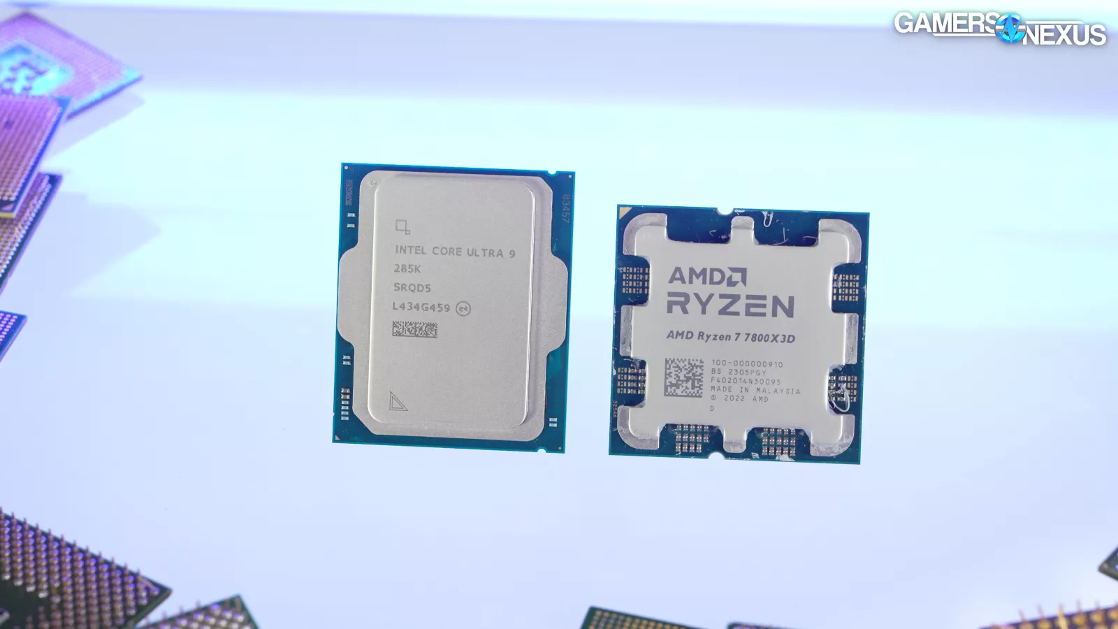 The new 285K is flanked by the best gaming CPU with the 7800X3D (watch our review) -- which is also the most efficient CPU we’ve tested recently -- and the 9950X and 7950X for production.