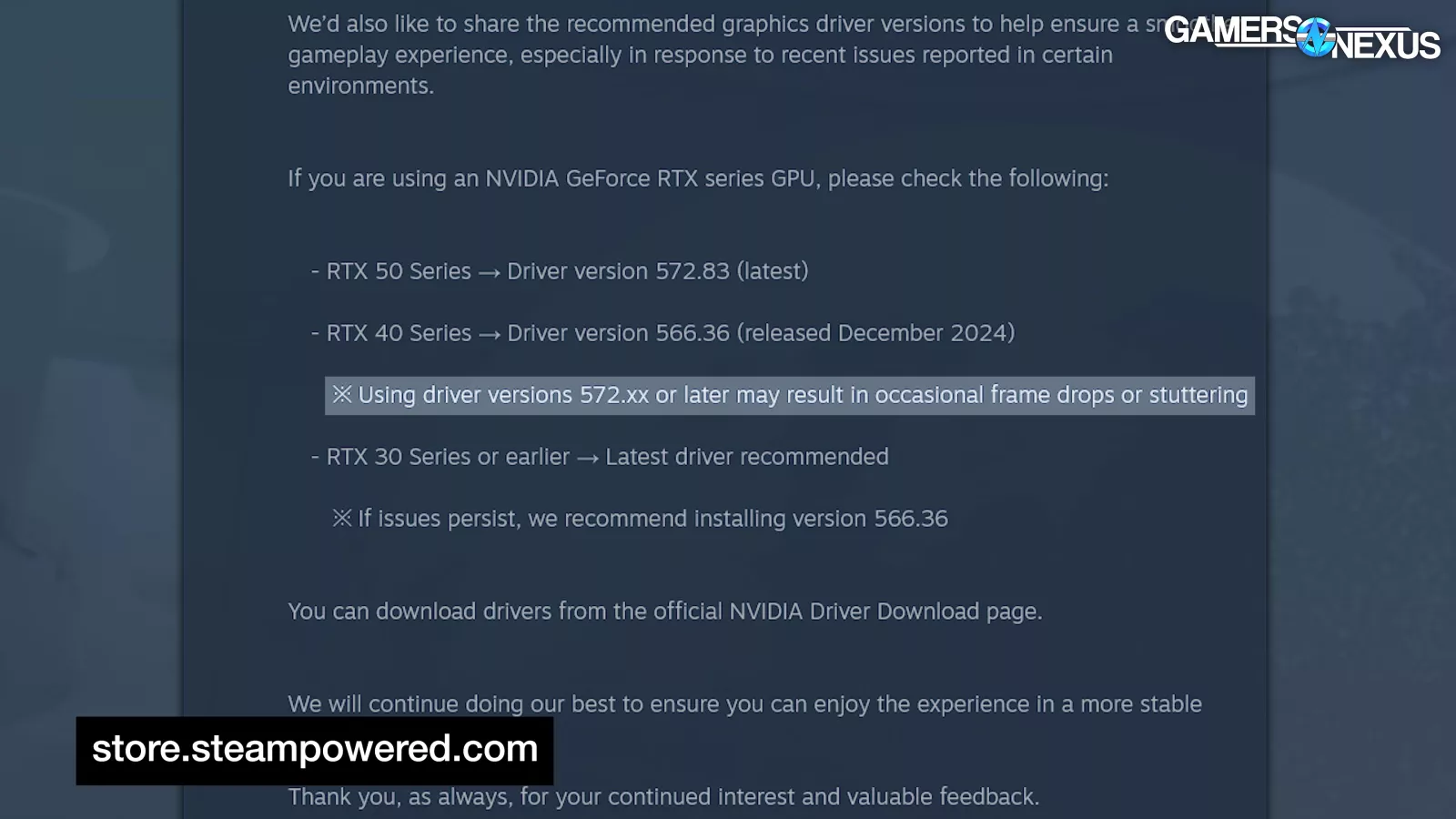 inZOI, the studio which NVIDIA has heavily promoted for partnership with its AI features, threw NVIDIA under the bus, stating, “Using driver versions 572.xx or later may result in occasional frame drops or stuttering [...] If issues persist, we recommend installing version 566.36.” This driver is from December.