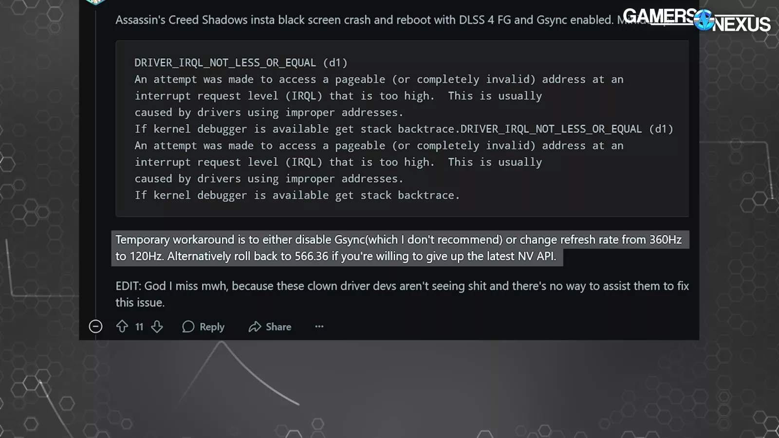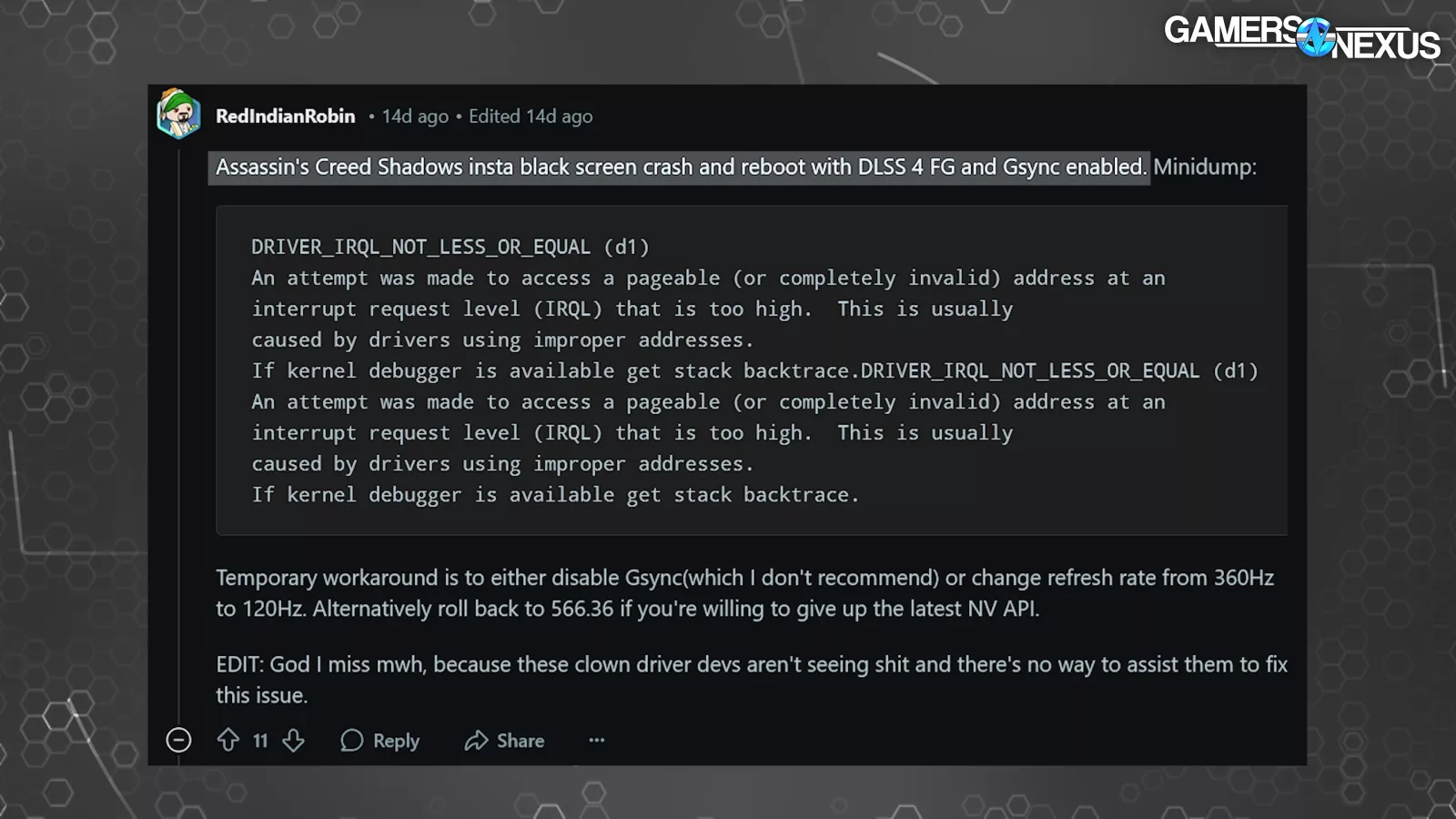 We’ve known that NVIDIA has shifted its focus towards larger business clients and away from its gaming market. That’s fine -- but it shouldn’t be screwing up areas where it has long had such refinement. NVIDIA is known for its driver stability, and the company, in its series of screwups for 2025, is starting to chip away at that in an era where AMD’s drivers have become relatively stable. These driver issues are another mark upon NVIDIA’s tarnished gaming reputation with the 50-series launch as the company shifts focus, but losing prior-gained ground shouldn’t be in the cards, and NVIDIA hopefully will recognize that these issues are damaging to its long-term brand credibility.
