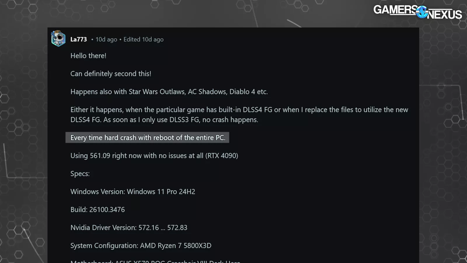As for similarities between the issues: In Star Wars Outlaws, Marvel Rivals, and Cyberpunk 2077 (all games that natively support DLSS 4), we were unable to produce a failure when either G-Sync or frame gen were disabled. We also separately couldn’t trigger a crash after swapping output slots or on a single monitor setup.