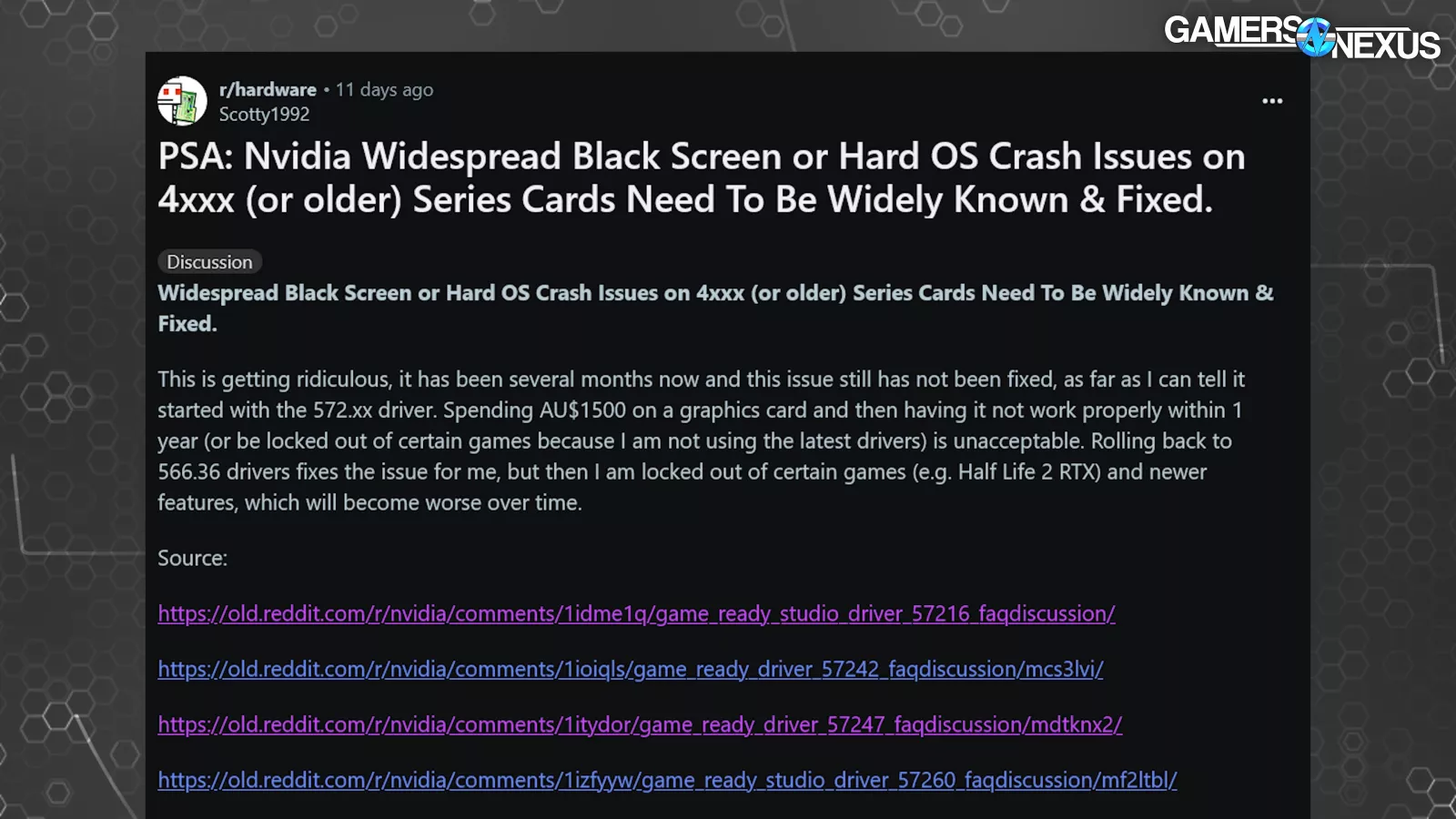 Several users speculated on the impact of multiple monitors, the impact of mixed or higher refresh rates, and even how NVIDIA’s own G-Sync might be affecting the driver stability.