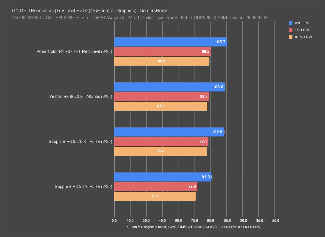The RX 9070 XT Red Devil draws upon the very evils which it is rendering with its Hellstone to run at 198 FPS AVG, about a 3 FPS lead over the Waifu. That’s about 1.7% ahead. The Waifu outruns the Pulse, though, and you don’t need to be the fastest when you’re running from zombies -- you just need to not be the slowest.