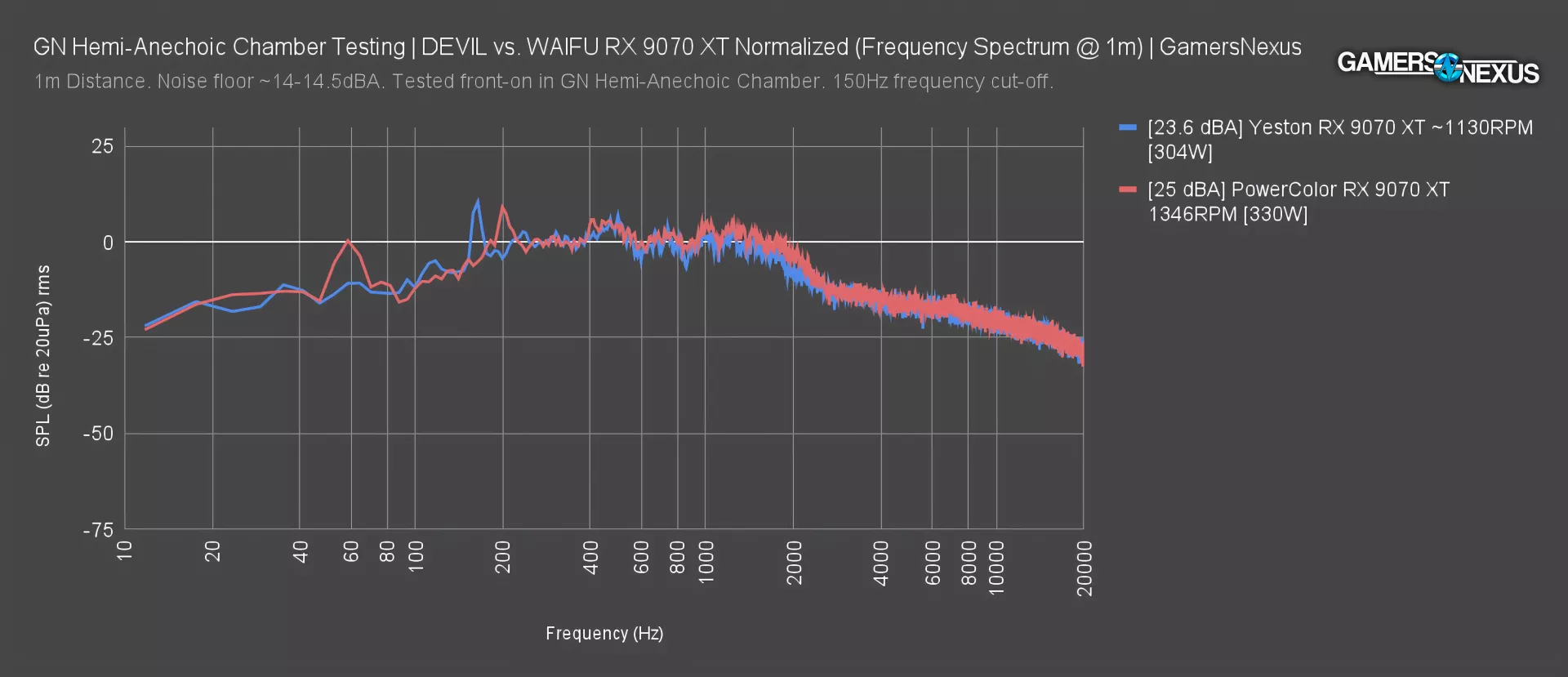 The Yeston RX 9070 XT Waifu edition ran at 1,130 RPM when under default VBIOS control at 304W in the workload that we ran. The card ran at 23.6 dBA at 1 meter when tested under the conditions we used for thermal testing. The frequency spectrum analysis has the highest spike around 164 Hz, with a swell around 500 Hz and a later bump and dip in the range of 1,000 Hz to 1,400 Hz.