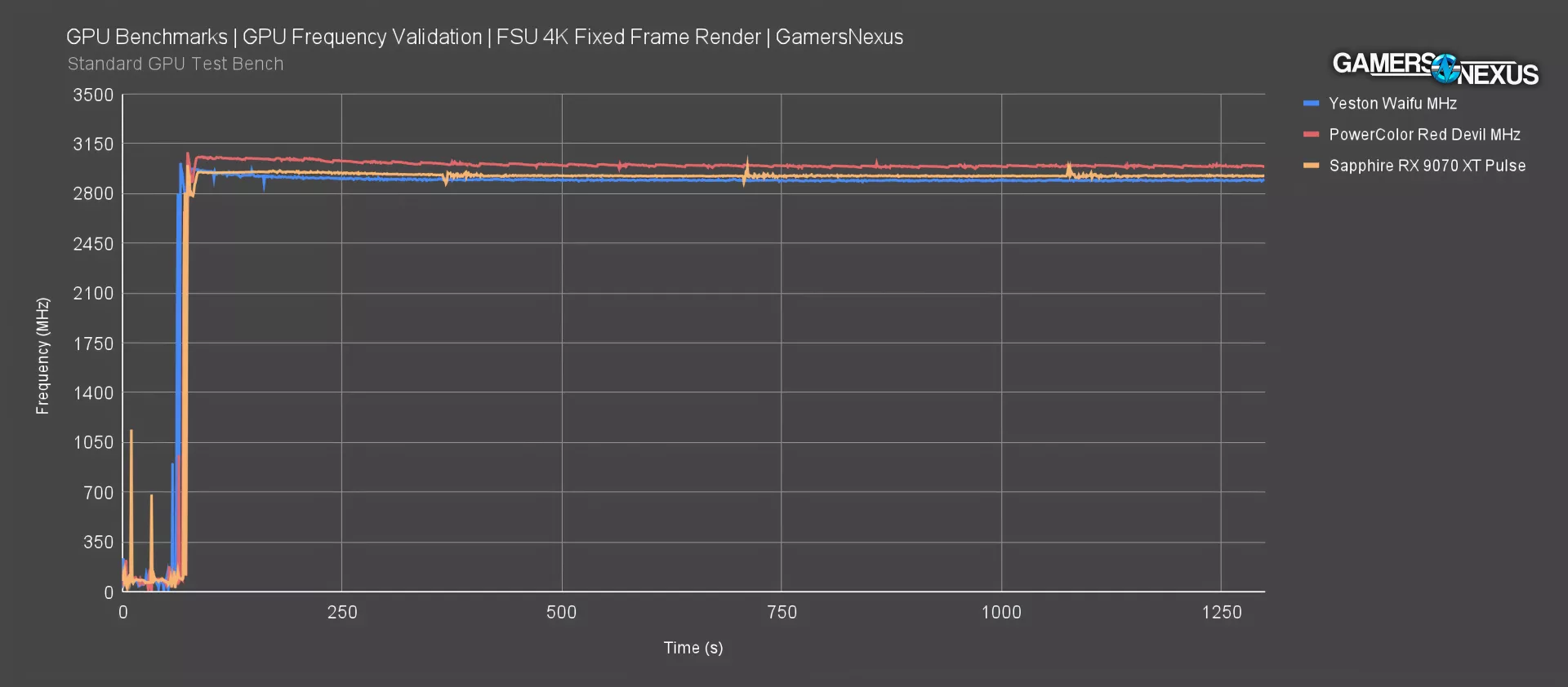 GPU frequency is the next test in this battle of the memes. The Yeston GPU ran at about 2,890-2,910 MHz in this workload when running a fixed frame render. The Red Devil ran notably higher, up at 2,970-3,000 MHz instead. That’s around a 60-100 MHz bump in most instances, so the extra power is going somewhere, and it’s sustaining that frequency.