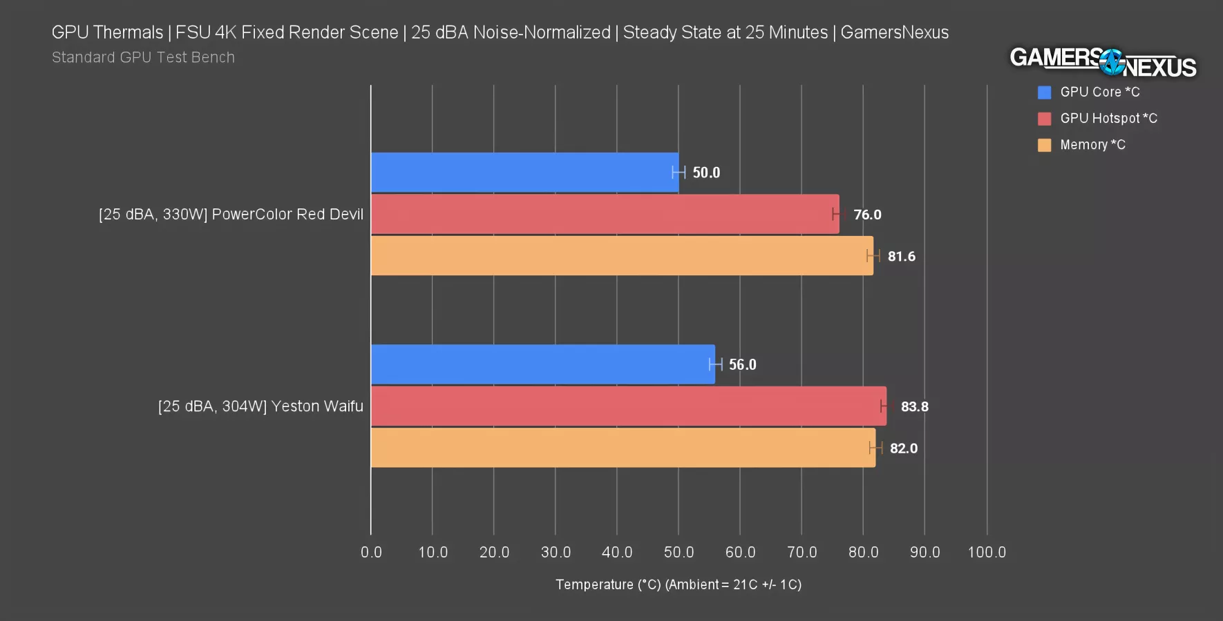 The steady state 3DMark workload has the Waifu now 6 degrees warmer than the Red Devil in a searing blow to the Waifu, whose ocean and its scent-imbued plastic is evaporating before our very eyes. Boosting the Red Devil’s fan speeds to match the noise levels of the Waifu’s brings it down significantly, showing that it is the better card in like-for-like acoustic testing. Even with its smoldering Hellstone, the Red Devil has a 76-degree hotspot and delta of 26 degrees, improved from the Waifu’s 84-degree hotspot delta of 27.8-degree delta. This means the waifu is hotter here. Memory thermals are functionally tied between them, showing that PowerColor’s main area to improve is VRAM thermals. All of these numbers are acceptable, though, with the GPU numbers just straight-up good for both companies.