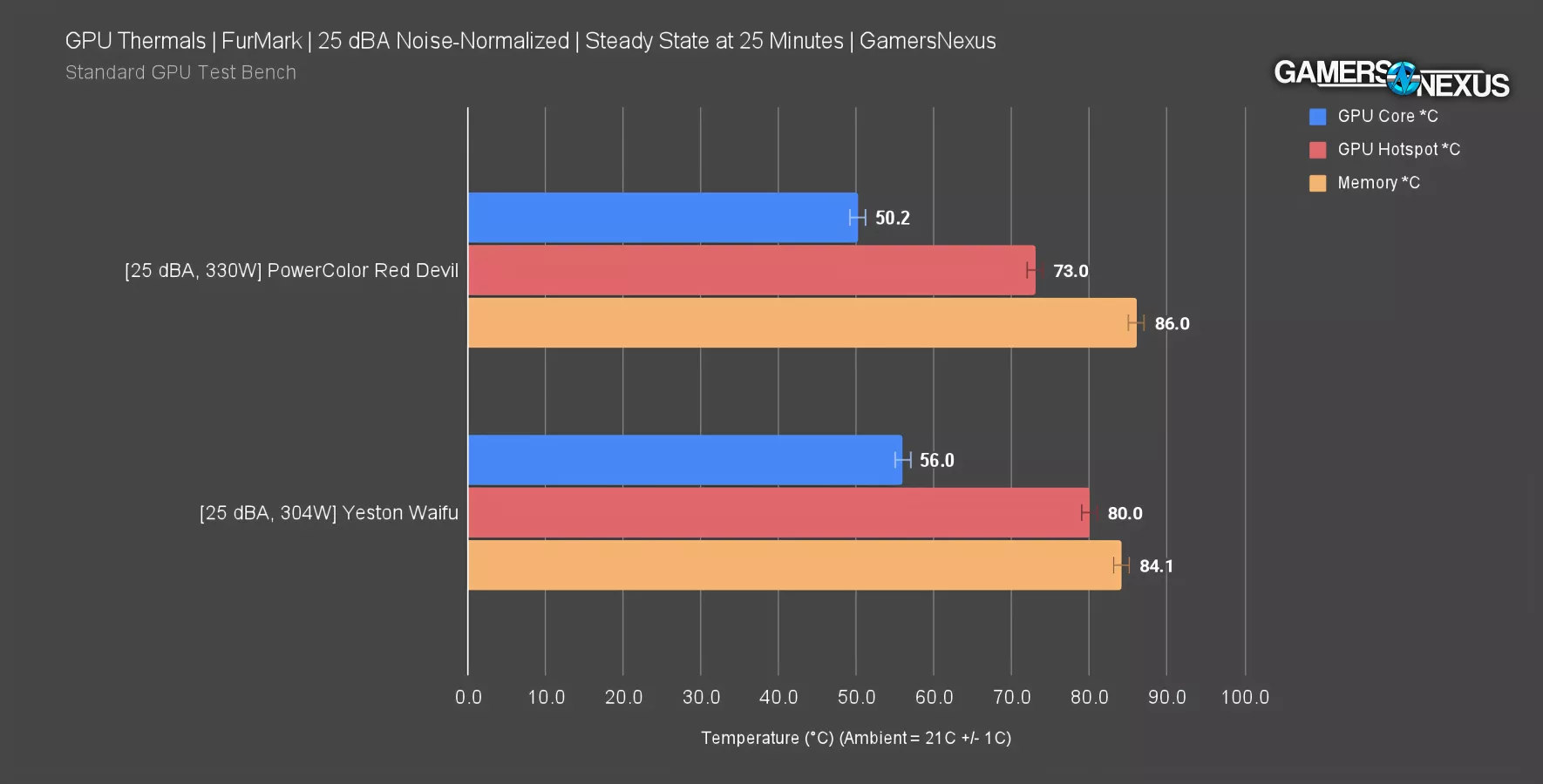 In FurMark at 25 dBA, which loads the GPUs more heavily on the VRM, the GPU temperatures ended up comparable between these with the memory temperatures favoring the Waifu by about 2 degrees reduced from the Red Devil.