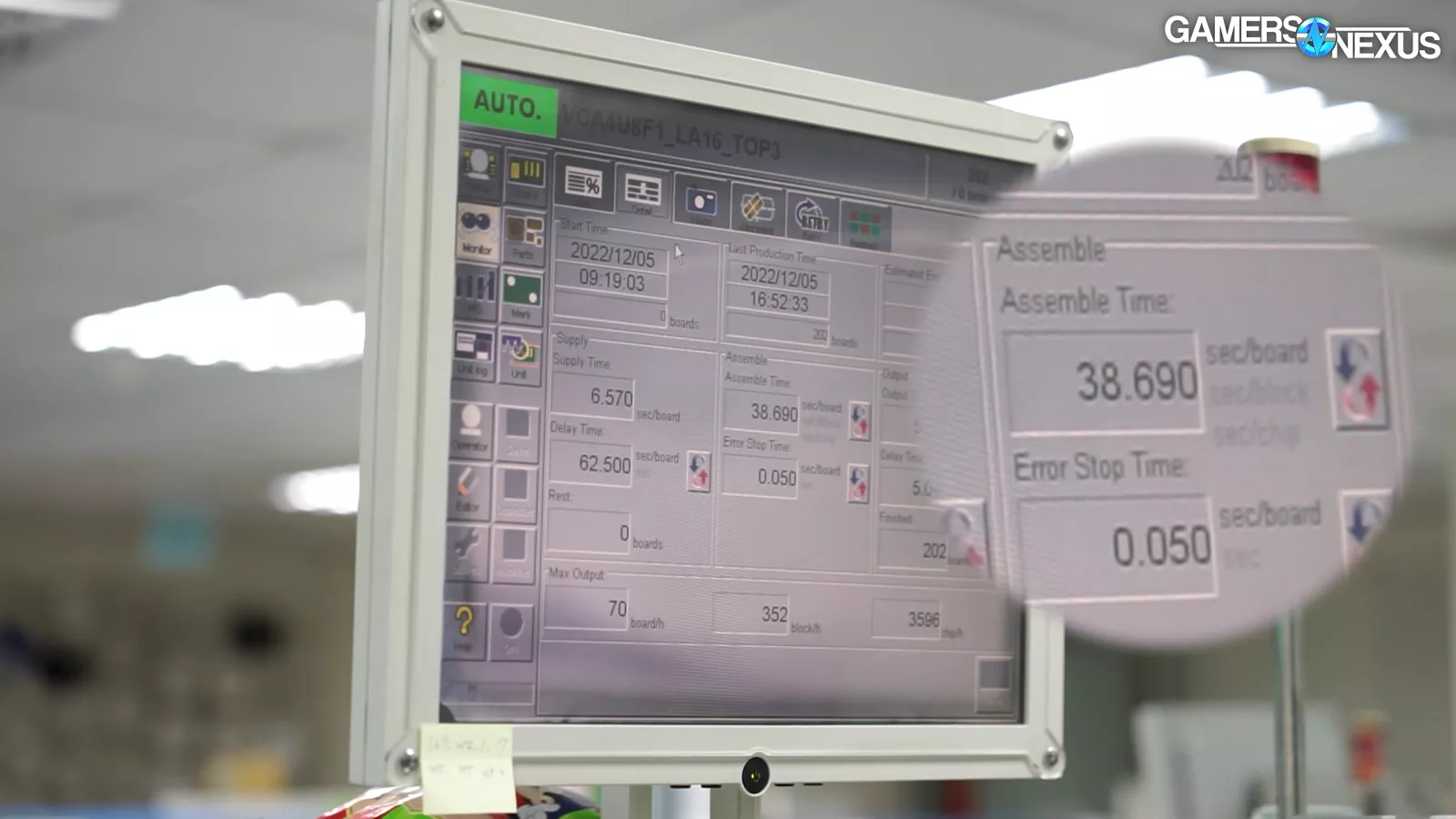 But there’s another secret we get to show in this tour: A second screen. This one tells us the time break-down, and also outs how long we’ve held onto this footage. You can see that the assembly time is 38.68 seconds per boards, which is impressively fast. Currently, the line is processing 3,529 chips per hour and 70 boards per hour, averaging about 50 components per board.