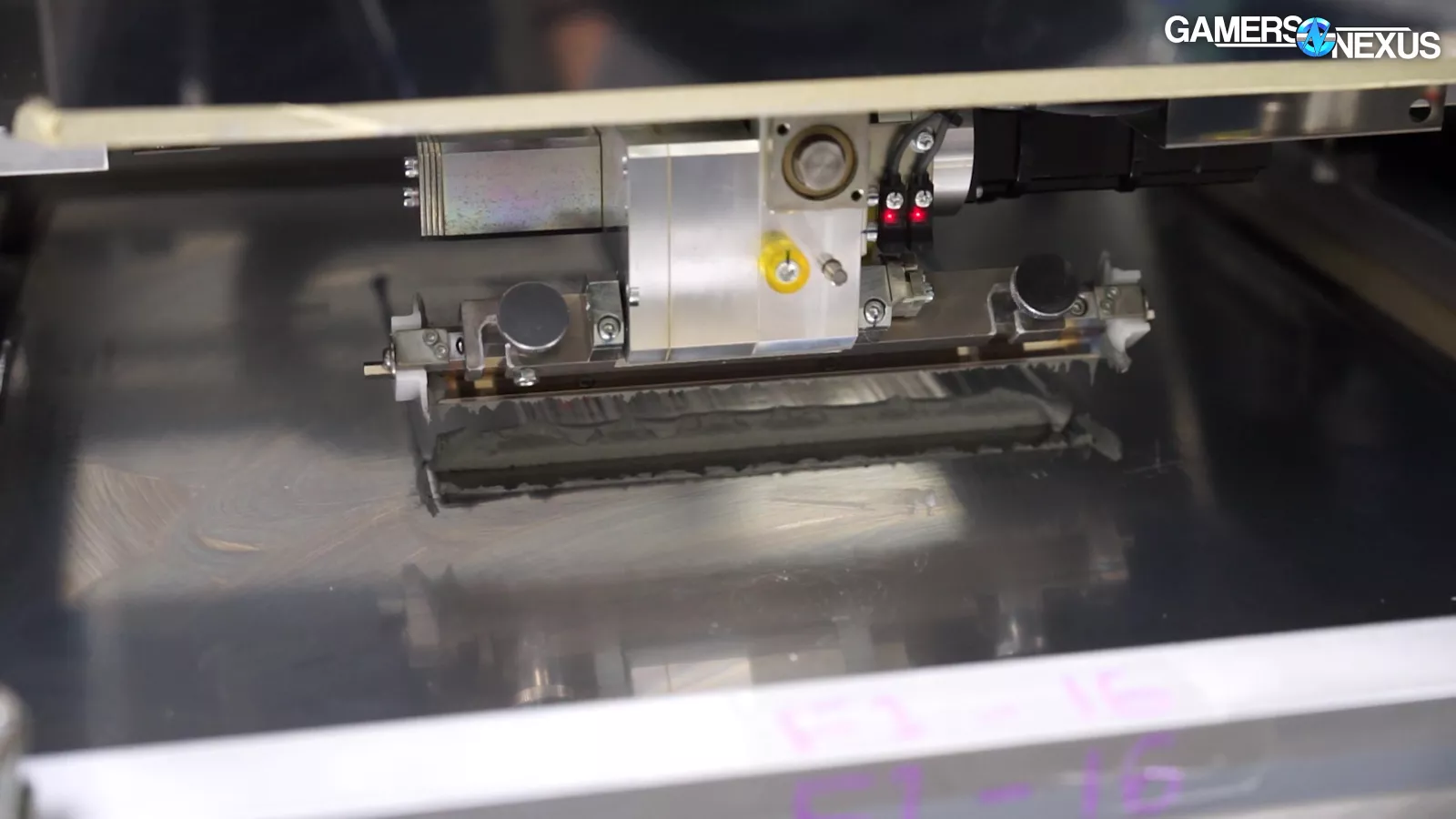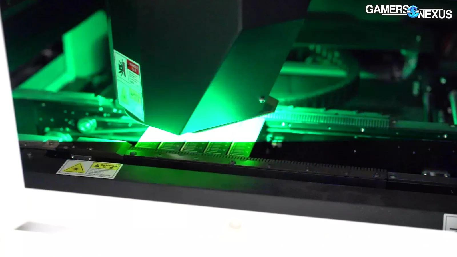In this shot, we can see the memory chips themselves getting placed on the PCB by the robotic arm, before and after each movement it’s optically scanning to ensure accurate placement prior to baking.