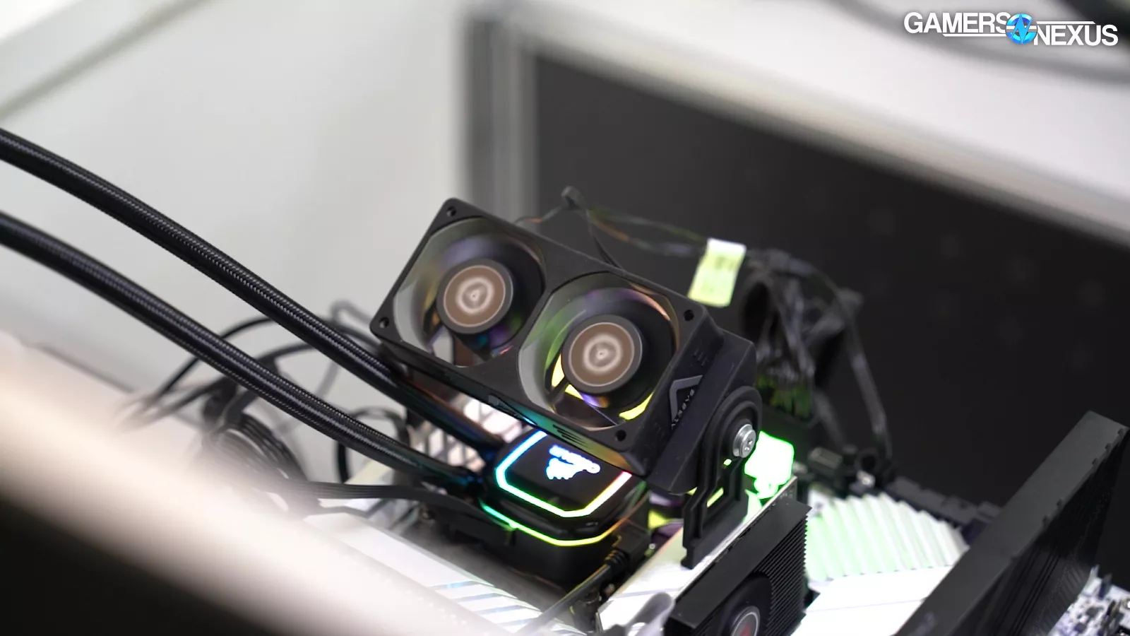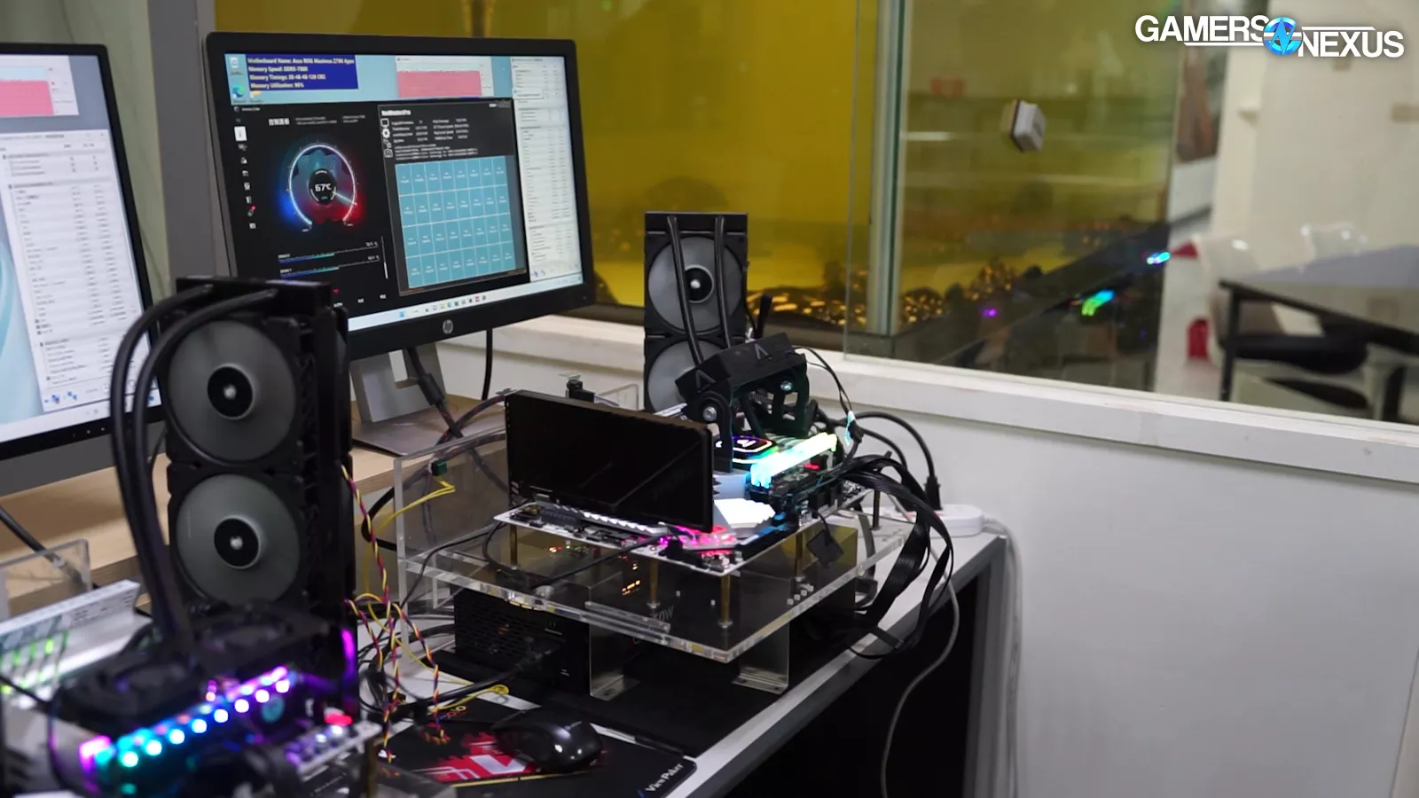 At a surface level, these are just test benches: They consist of a normal motherboard, CPU, and cooler. But on closer inspection, the memory is socketed into special risers, functioning as interposers that are used for validation and burn-in.