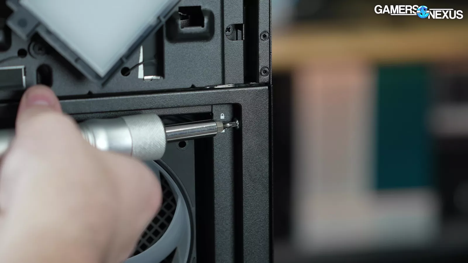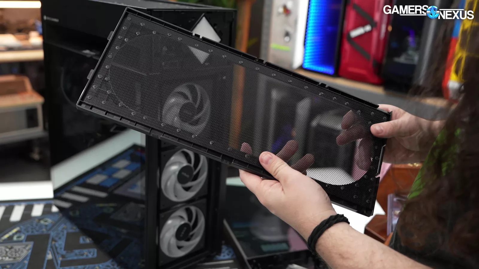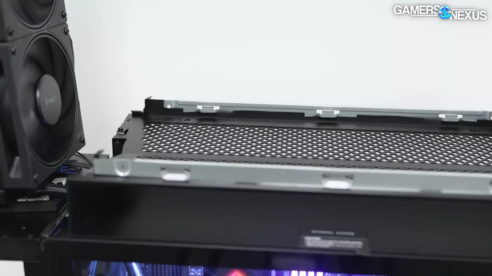 Continuing our tear-down, we removed the case’s front dust filter, which is behind a sheet of glass. This is, again, bad for airflow.