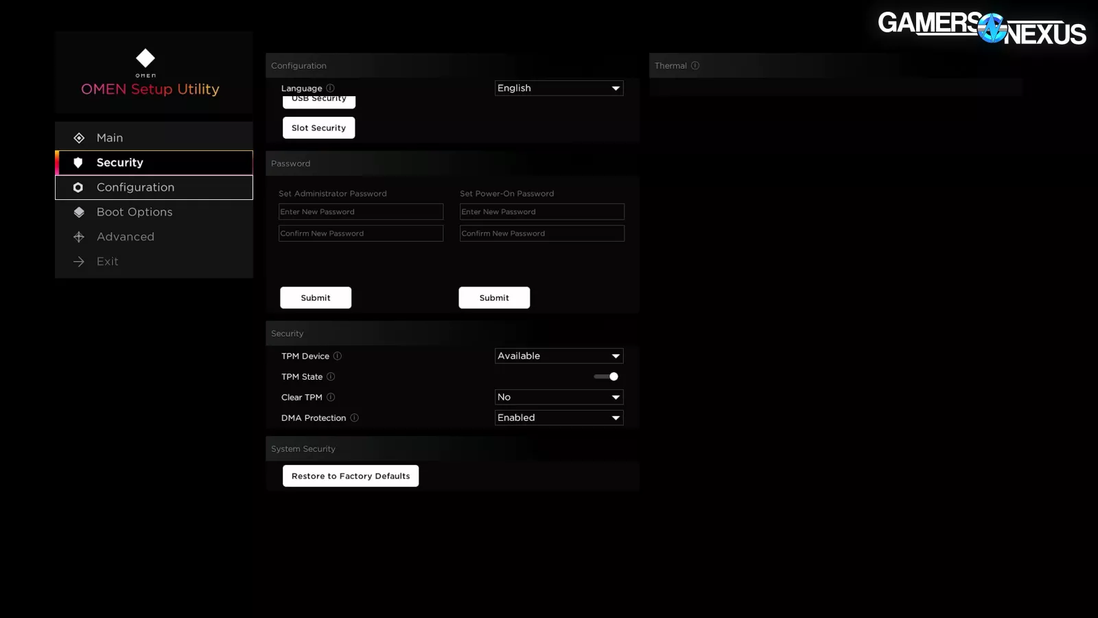 The BIOS itself is stripped-down compared to the full feature sets we’re used to on DIY boards, but enough settings are left exposed to make important tweaks if needed. Opening the Advanced page pops two full screen notifications – one strongly advertising the OMEN Gaming Hub software, and one with a warning about overclocking.