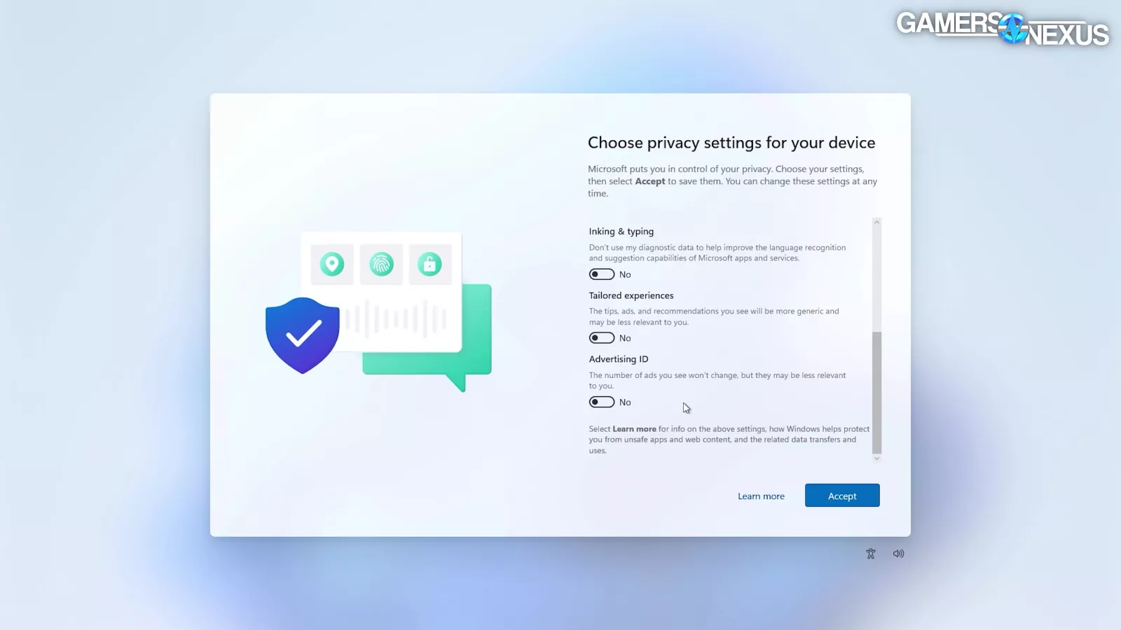 The next dialog box had even more attempts to harvest data. Opting out required clicking “manage options,” then individually toggling off App Analytics, Personalized Suggestions, and Advertising. That’s on a computer that’s about $5,000, by the way.