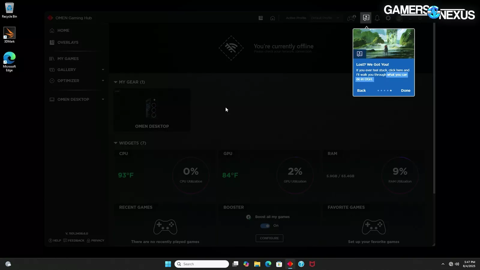 The OMEN Gaming Hub software was, uh, “interesting.” The intro dialog box had some cringey text, like “How about we elevate your gaming experience with badass capabilities?” and closing with “Go ahead and explore - we won’t bite.”
