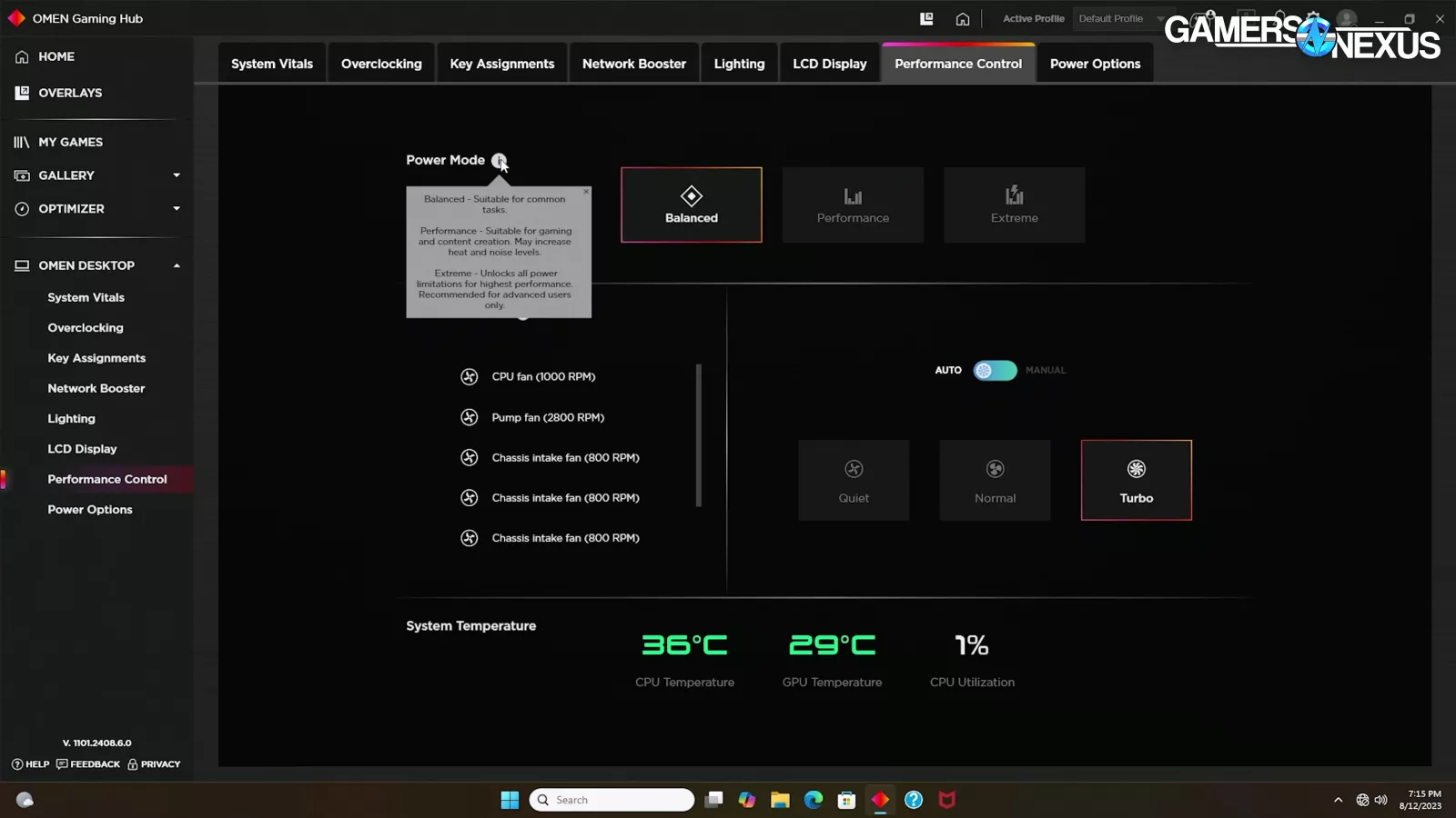 The Performance Control tab is where HP hid the CPU power limit controls, but only by way of 3 preset modes. “Balanced” is the default, setting PL1 to 125W and PL2 to 295W. “Performance” sets PL1 to 190W, and PL2 still at 295W.