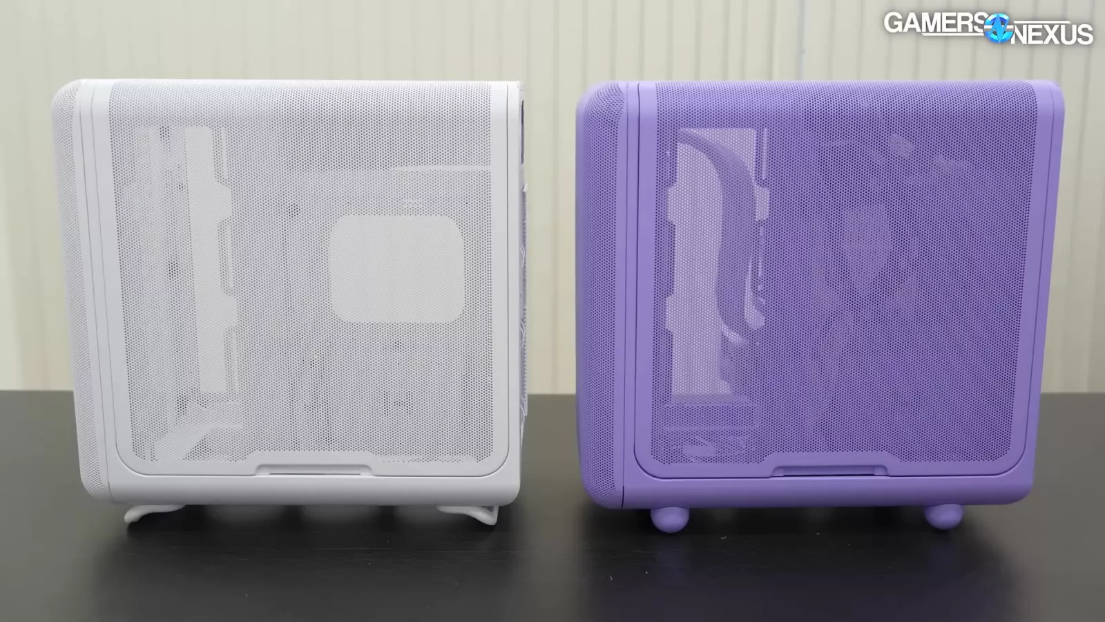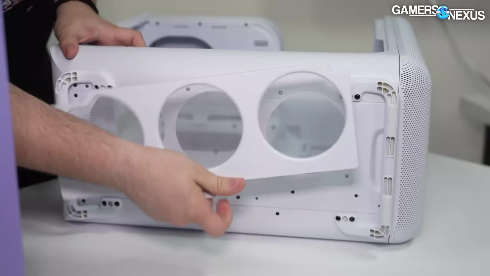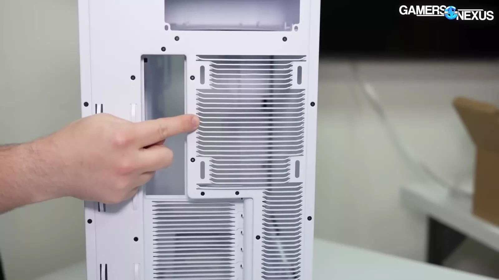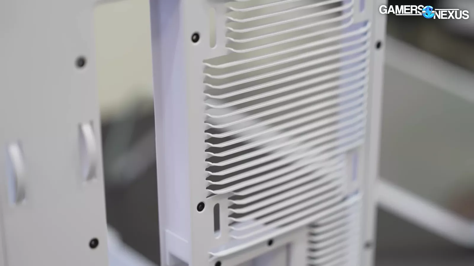 Another unit we looked at used lower porosity mesh on the edges, which is what the factory Hyte worked with said was the limit of what it could do. Hyte couldn’t accept this design, however, as they were targeting over 40% porosity. Teller says the X50’s final design ended up having about 45% porosity with 2mm holes and 3mm spacing.