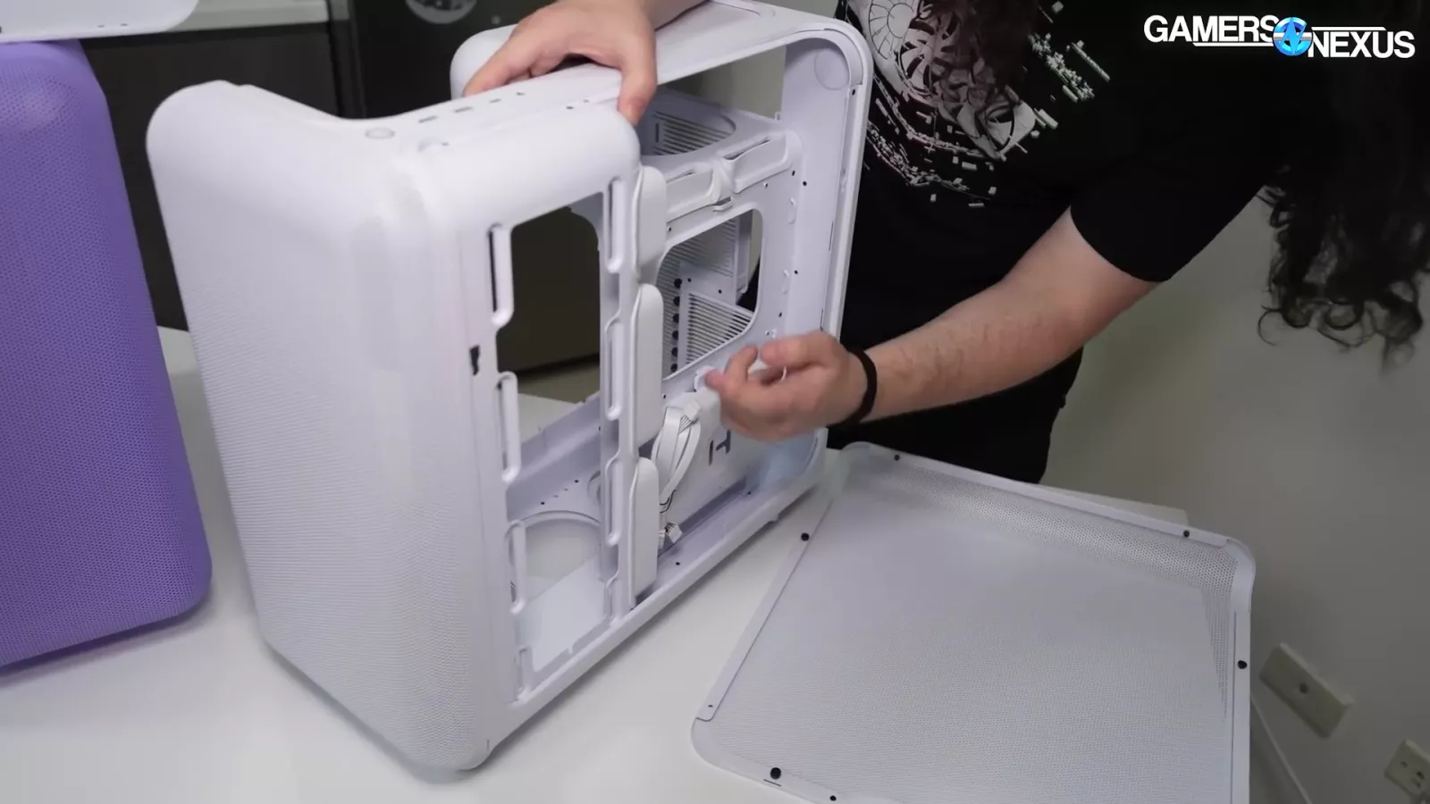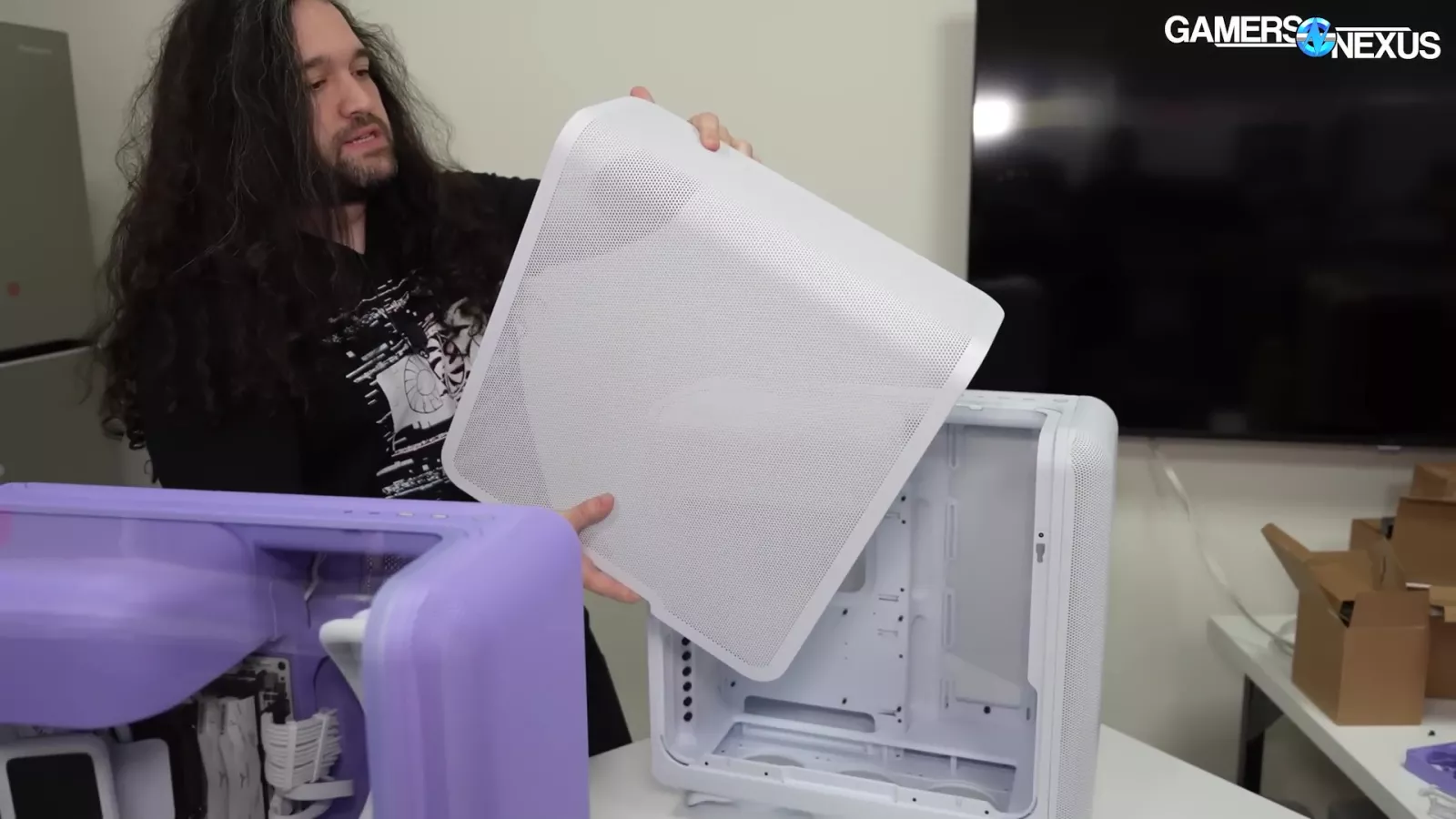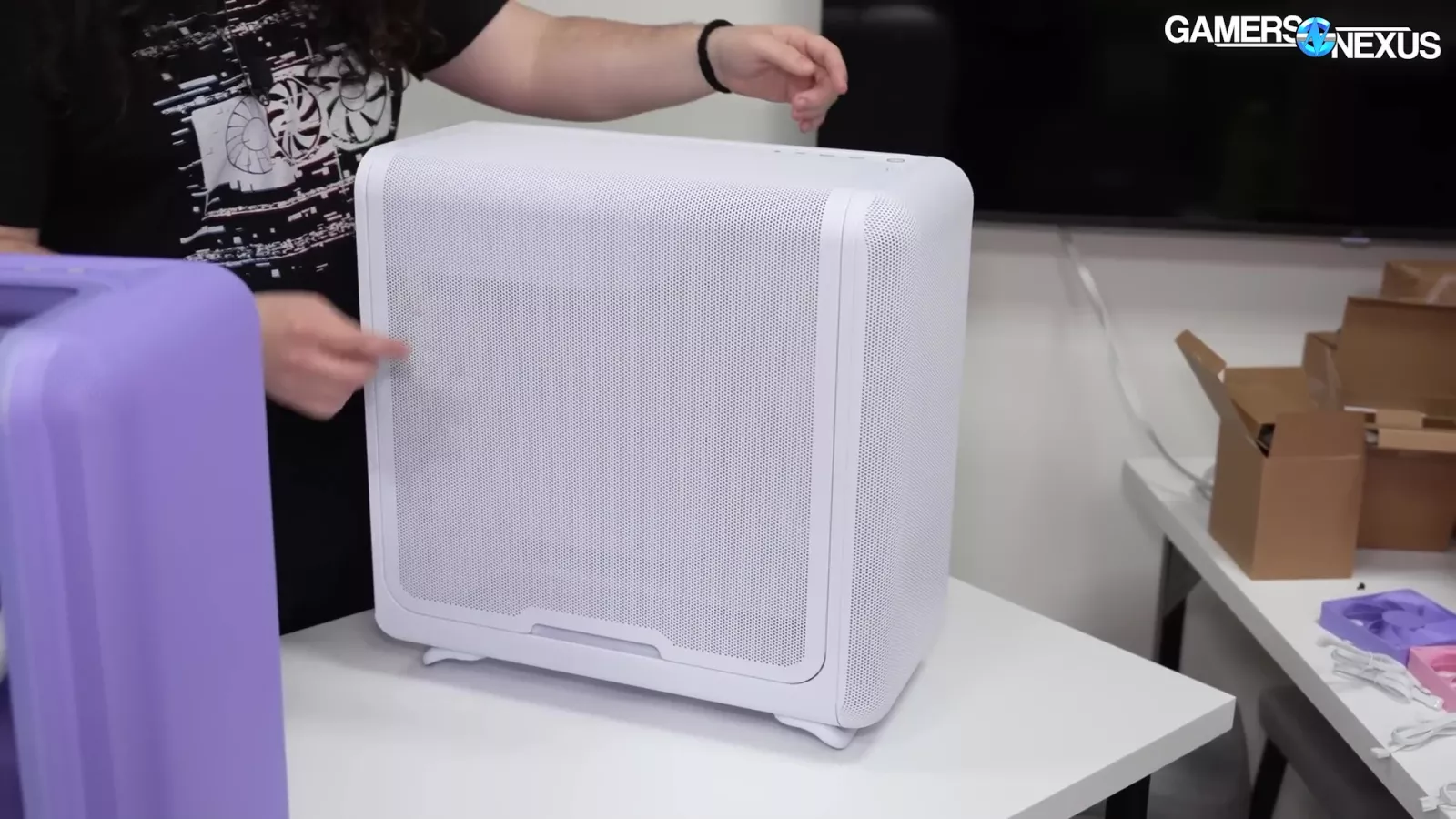 Another unit we looked at used lower porosity mesh on the edges, which is what the factory Hyte worked with said was the limit of what it could do. Hyte couldn’t accept this design, however, as they were targeting over 40% porosity. Teller says the X50’s final design ended up having about 45% porosity with 2mm holes and 3mm spacing.