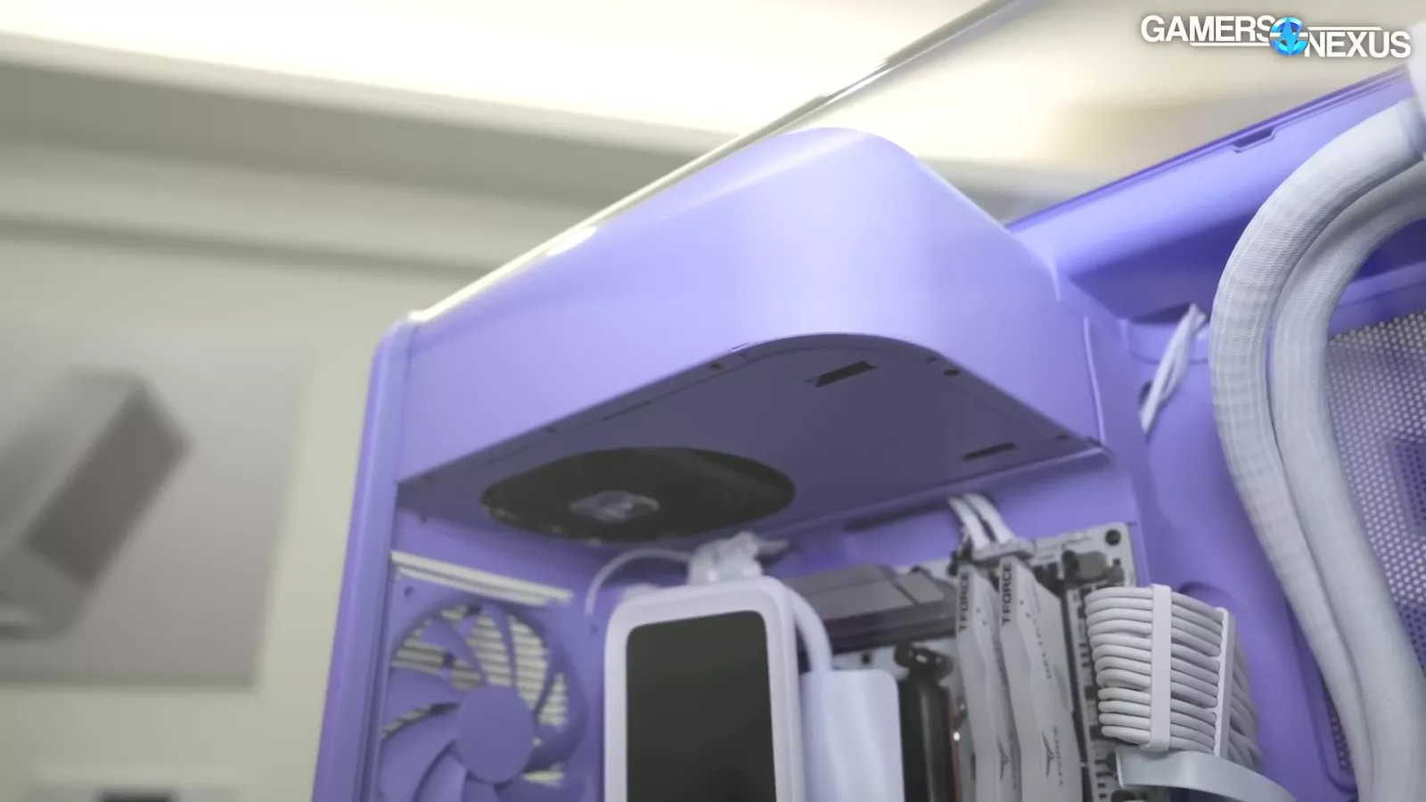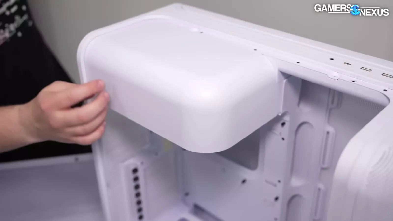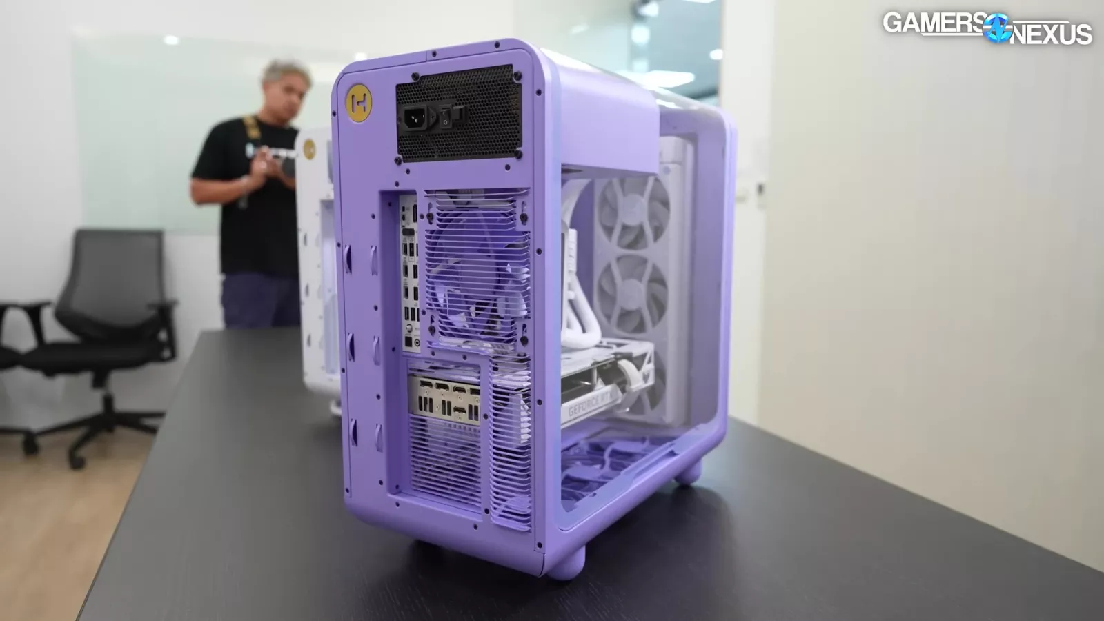 The horizontal louvered vents on the back are mostly straight, even though they may not look like it on camera. There were 2 reasons for its design here. Hyte tells us it was for structural reasons and flow. We often talk about impedance to flow into a case, but impedance to flow going out doesn’t come up as much. There were a few instances in which we have brought it up, like in the Lancool 207 (read our review), where it has a really restricted airflow in one of its panels. In theory, being able to help the air exit faster should help with thermal performance. Hyte is trying to make a thermal performance chart topper and we’ll see how it does in our testing.