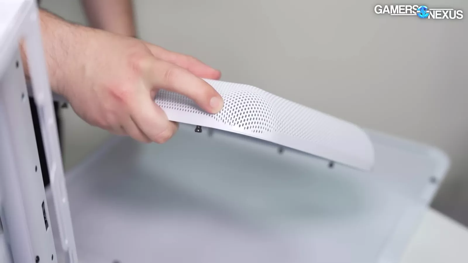 Looking at the final front panel design, there’s about 40mm of mesh depth and that’s stamped into a piece of steel that was at one point a solid piece. The company then folds the remaining solid piece, which have studs in them that click into clips.