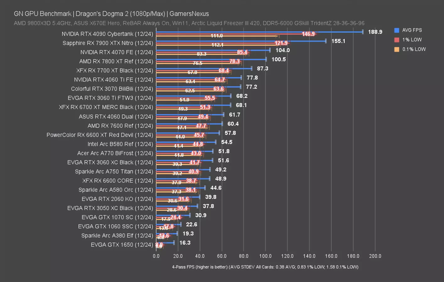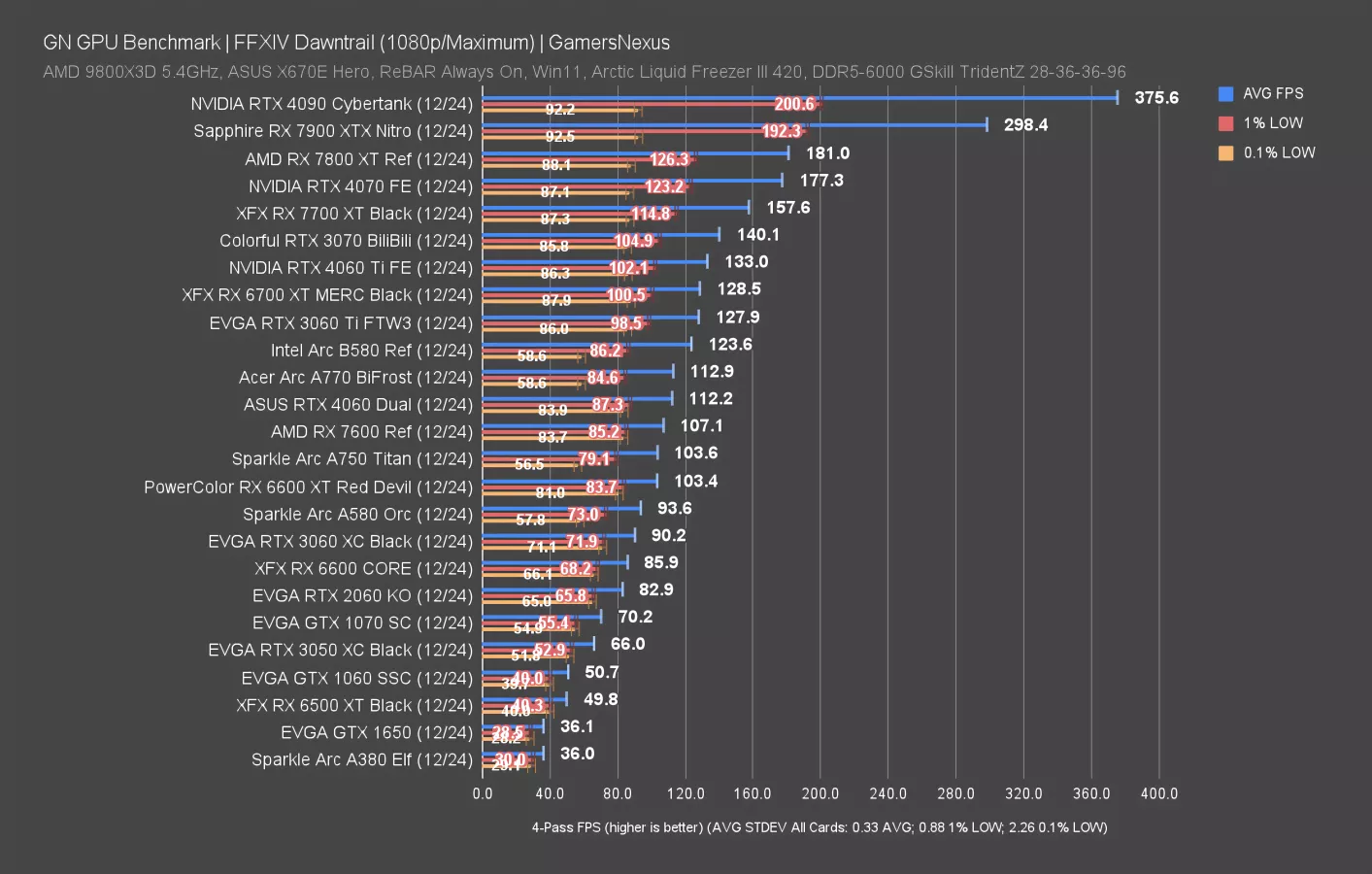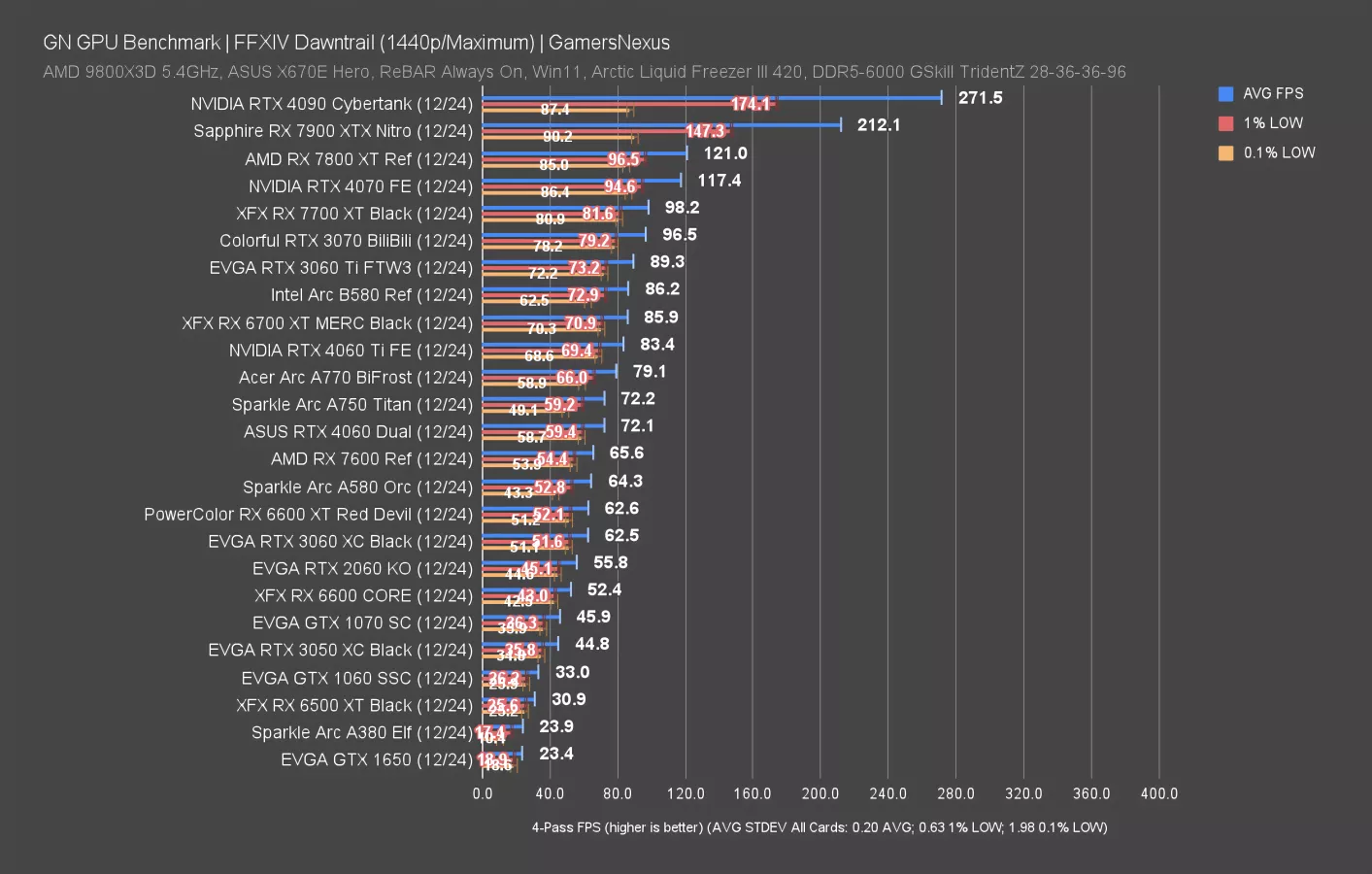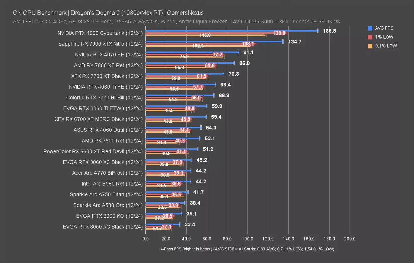 Our games list includes these. Not all of these will be shown in each review, but they are all tested. We’ve added Dragon’s Dogma 2 from 2024, Black Myth: Wukong from 2024, Baldur’s Gate 3 from 2023 -- which will be too easy for high-end GPUs, but is a good match for the B580, Starfield from 2023, Final Fantasy 14: Dawntrail from 2024, Cyberpunk: Phantom Liberty from 2023, and all the others you see above.