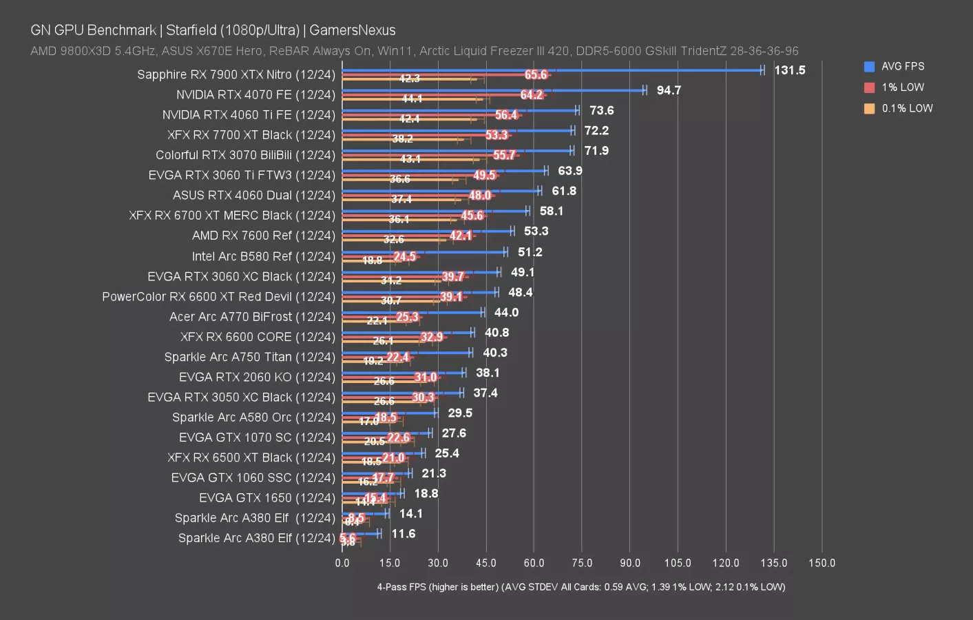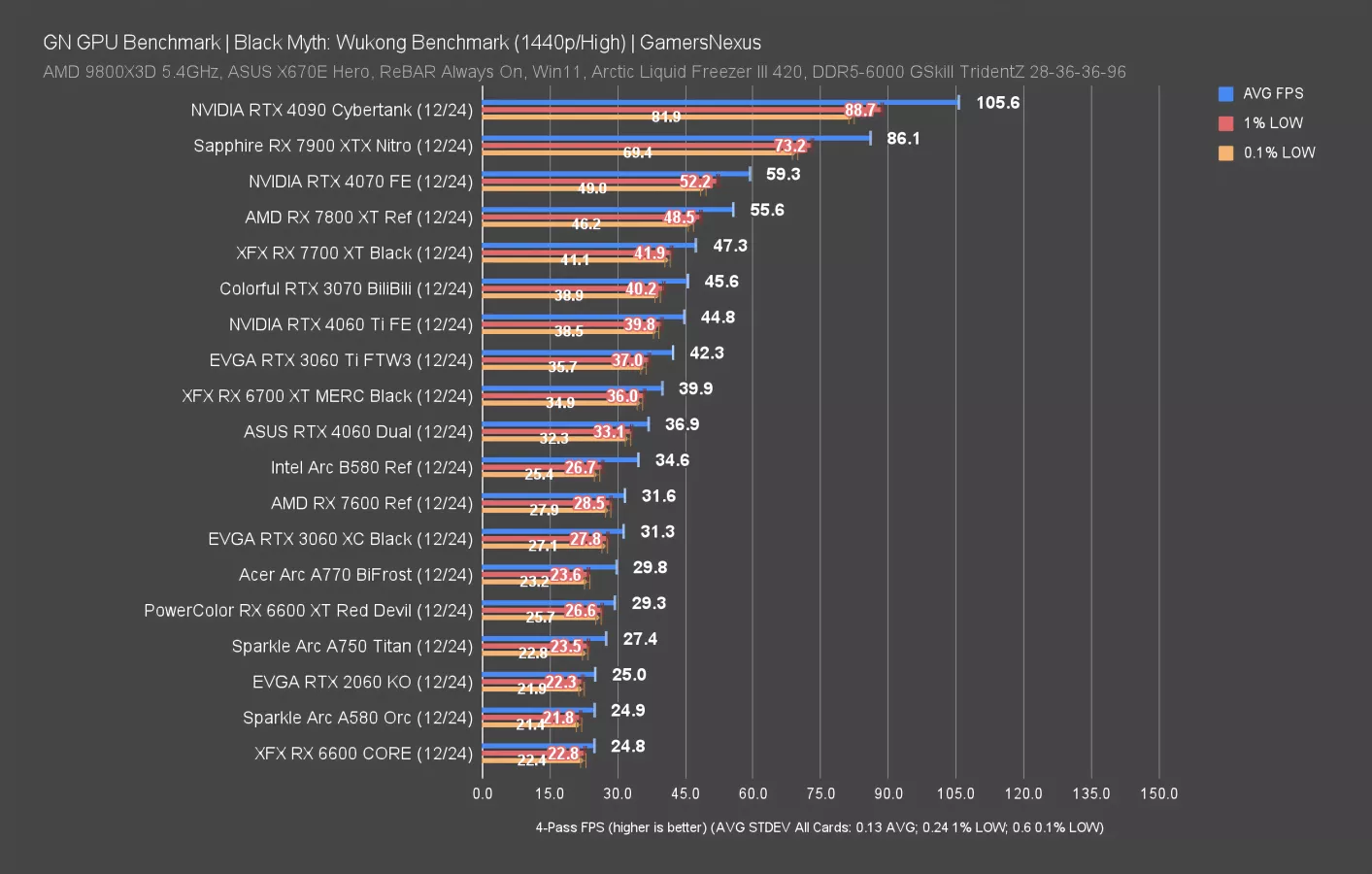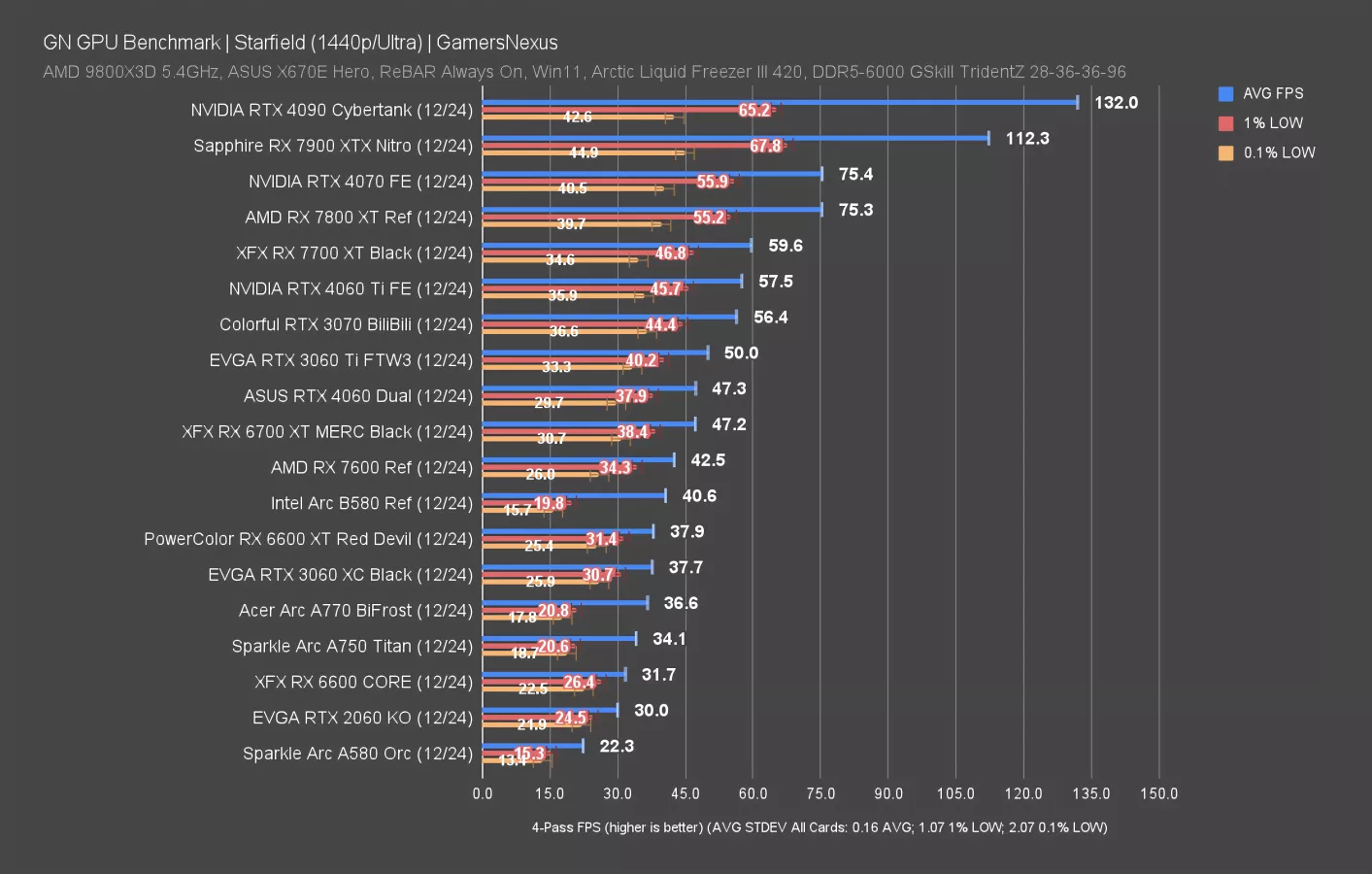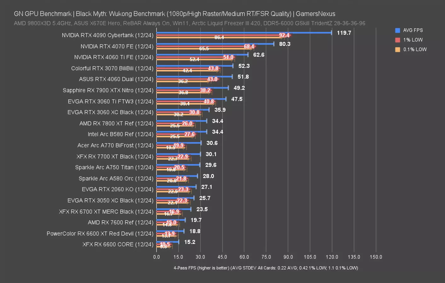 Our games list includes these. Not all of these will be shown in each review, but they are all tested. We’ve added Dragon’s Dogma 2 from 2024, Black Myth: Wukong from 2024, Baldur’s Gate 3 from 2023 -- which will be too easy for high-end GPUs, but is a good match for the B580, Starfield from 2023, Final Fantasy 14: Dawntrail from 2024, Cyberpunk: Phantom Liberty from 2023, and all the others you see above.