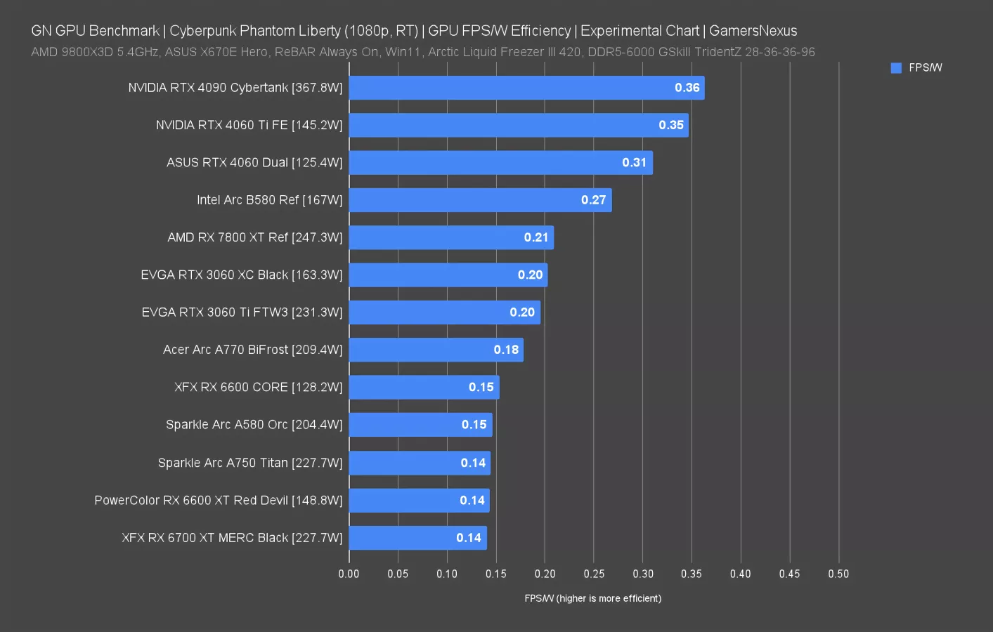 The RTX 4060 pulled 124W here, putting it at 0.58 FPS/W and almost 14% more efficient than the B580. That’s a good spot for the B580, despite being less efficient and pulling more power at 170W.