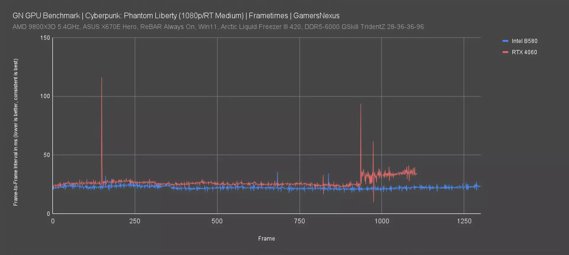 Lower is better, more consistent is best. Although the B580 is at times lower than the RTX 4060, the card experiences occasional but massive excursions from the previous frame. We’re seeing some jumps upwards of 20ms, which is noticeable, but not necessarily game-breaking -- it depends on the frequency of them. In this case, you’d notice. Arc has improved substantially from Alchemist in this specific regard, but it’s clear that Intel still has some work to do in at least Dx11 with this game.