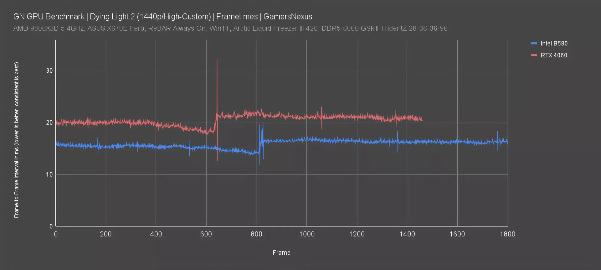In this one, the B580 had better frametimes across the entire bench pass. It’s lower overall, but also doesn’t experience any major unexpected deviations. Unlike the Baldur’s Gate chart, the B580 GPU is exceptionally consistent in its frametime pacing here. The 4060 ends up the worse of the two tested devices.