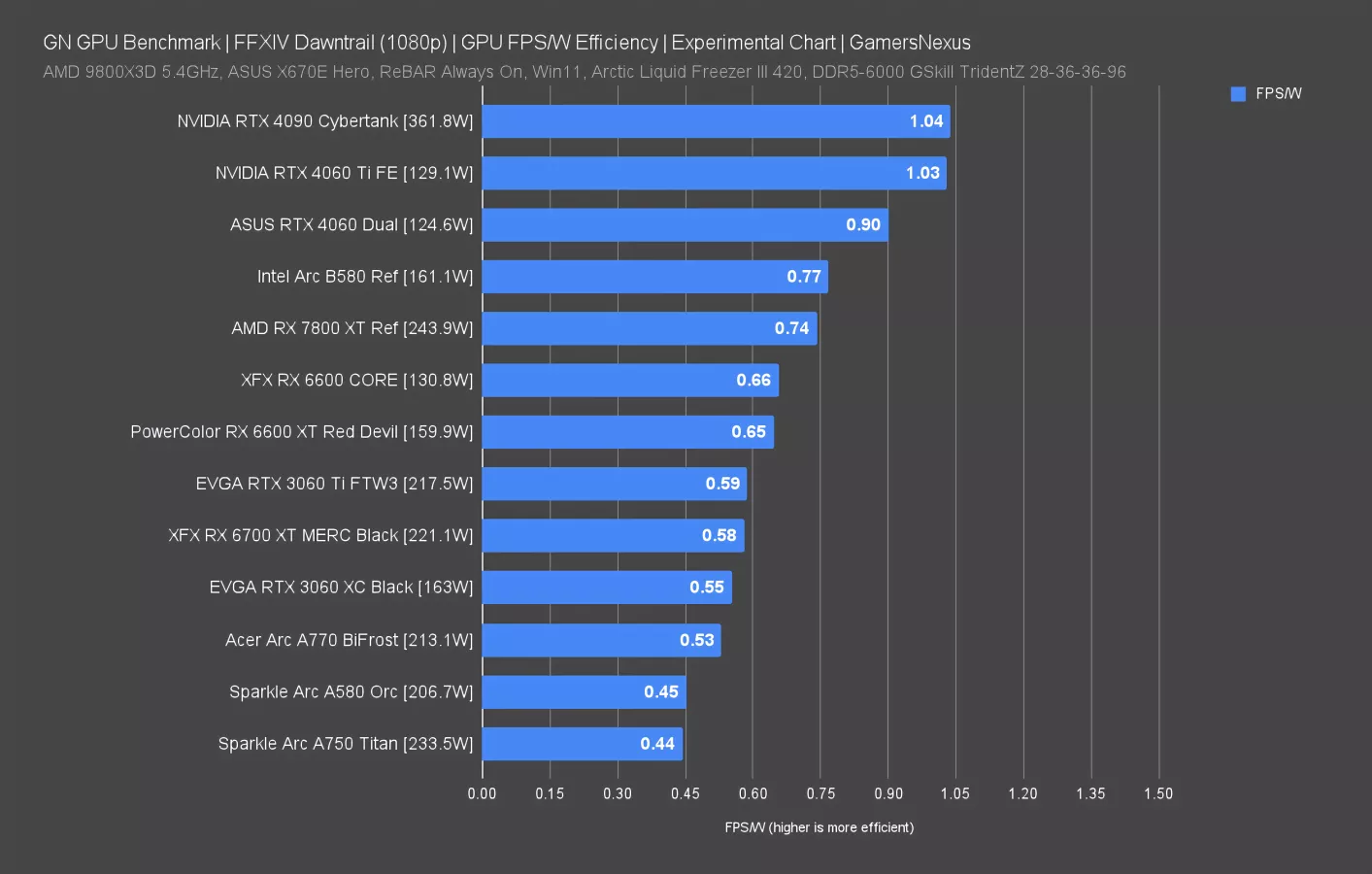This chart is for Final Fantasy 14 at 1440p, where it did well. The B580 ends up 4th on our list so far at 0.51 FPS/W, ahead of the 7800 XT and behind the 4060.