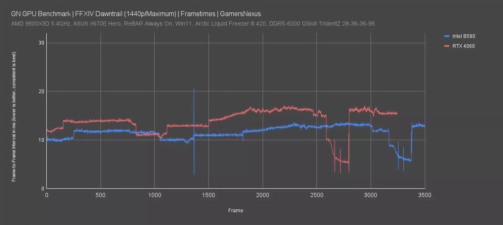 Final Fantasy 14 is next. In this one, B580 did well overall but had slightly reduced 0.1% lows versus the 3060 Ti and 6700 XT; however, it did better than the RTX 4060 across the board. In the frametime chart for Final Fantasy, we see an incredibly flat line with only one major spike that would hardly be noticeable since it isn’t repeating.