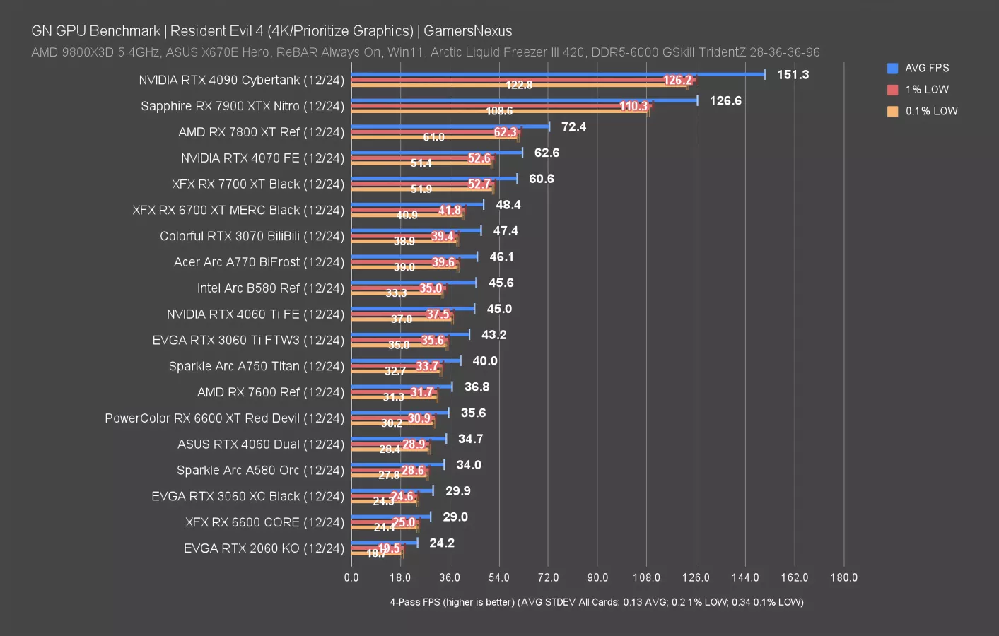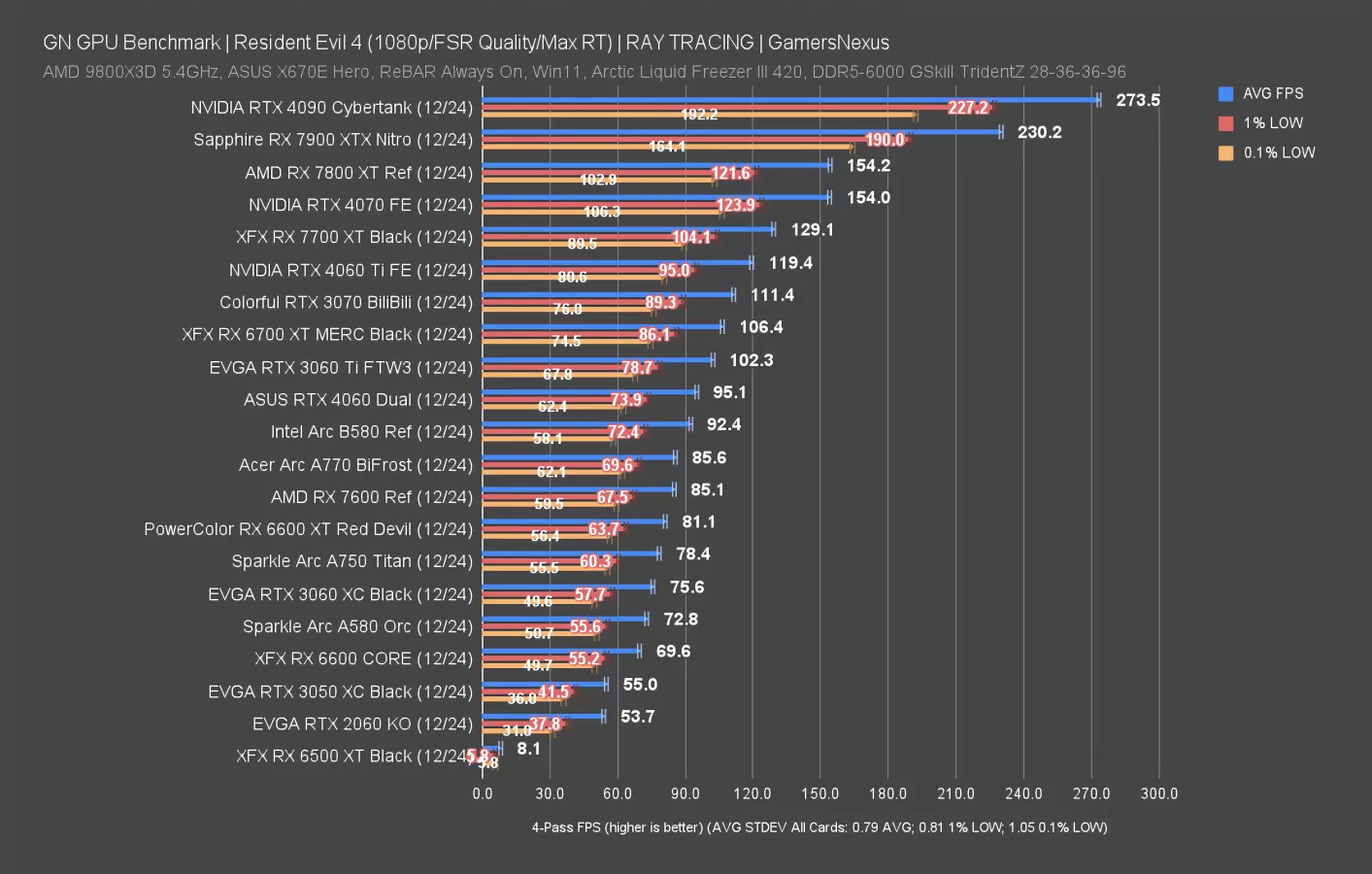 Resident Evil 4 is up first. This is a relatively light workload for ray tracing and isn’t as distorted for one vendor or another as some other games.