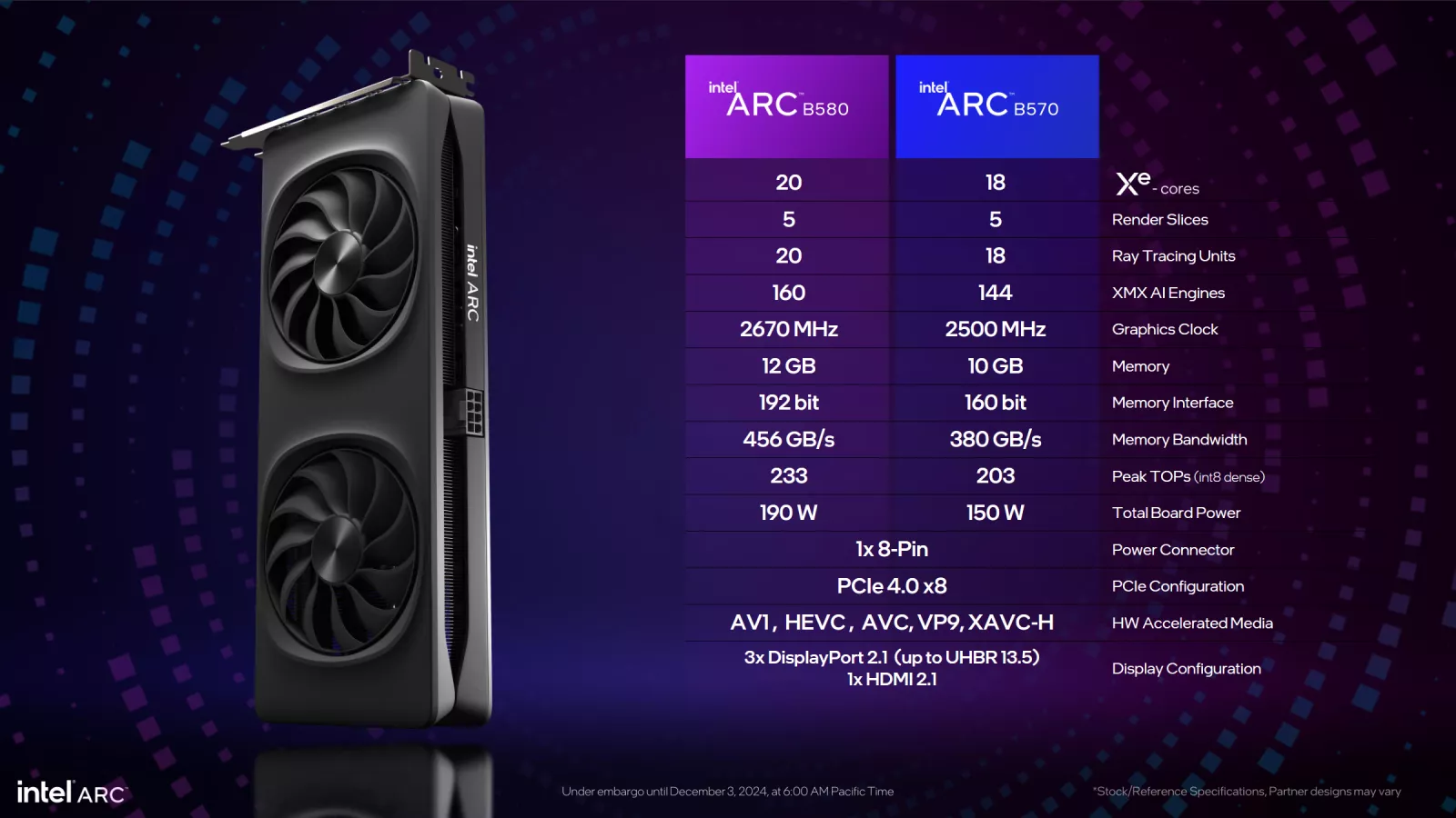 The card launches ahead of the B570 (watch our coverage), which launches next month. The B580 is a relatively small 20 Xe2 core configuration on the Battlemage architecture, making it smaller than the A750 or A770 in configuration size. Intel hasn’t yet announced 700-series cards in the Battlemage series.