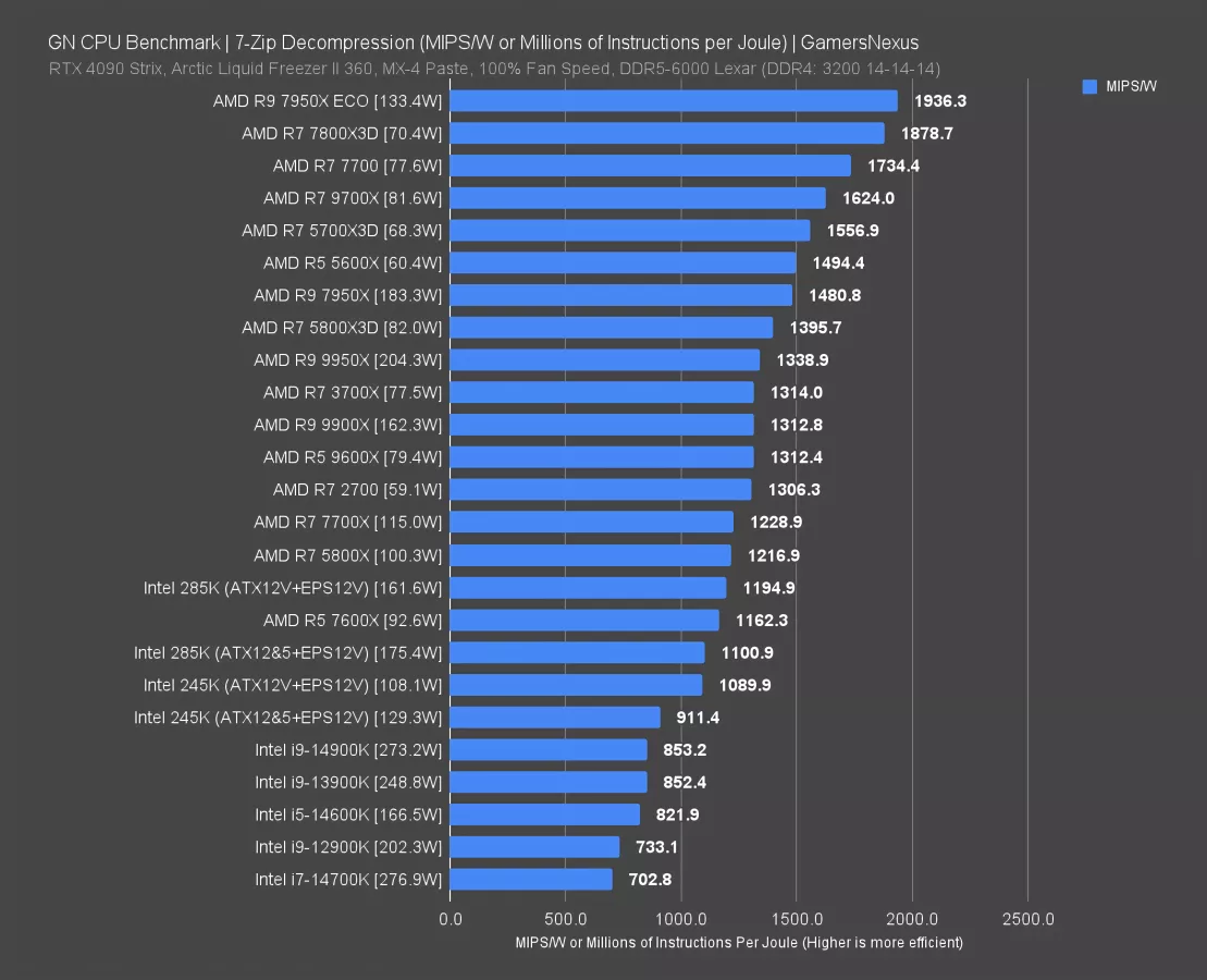 AMD remains the leader, with the 9600X at 1152.8 MIPS/W, the 5700X3D at 1281, and the 7700 non-X at 1436.2.