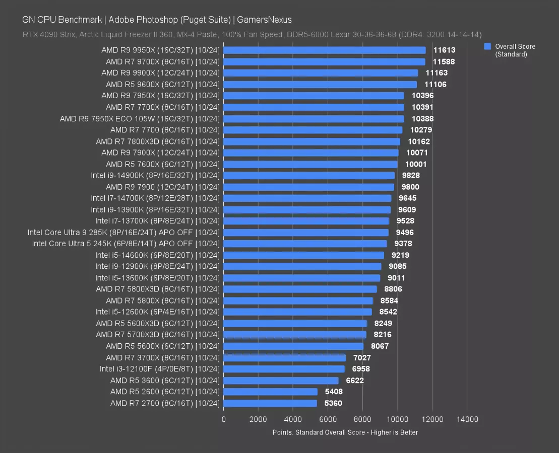 Adobe Photoshop is dominated by AMD in the current iteration of the software and Puget test. The 245K and 285K are far down the list, both behind the 13700K, 14700K, and almost everything modern from AMD. It’s not much of a contest here.
