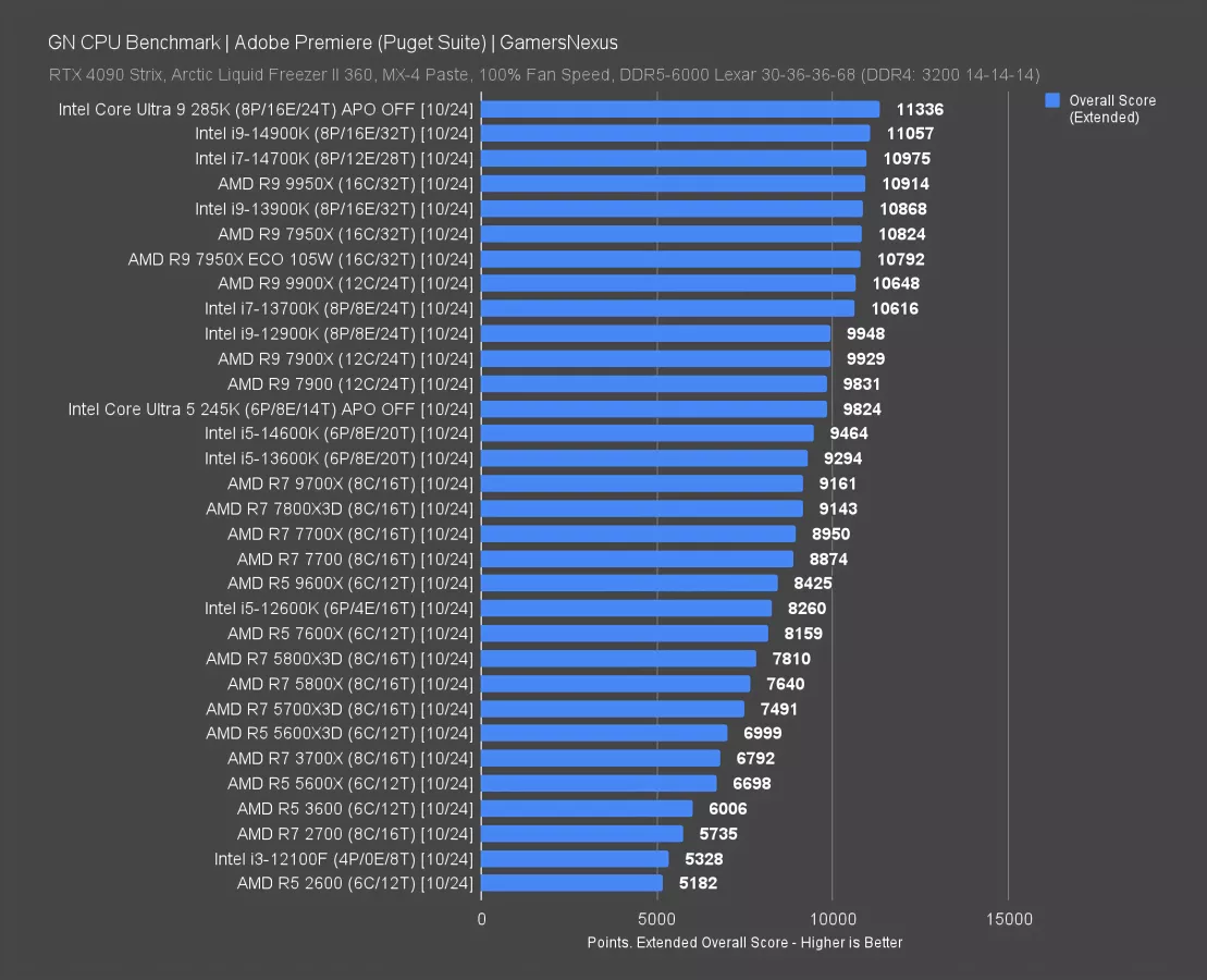 Using the Puget Suite, Adobe Premiere lands at 9824 points for the 245K. That has the new CPU sandwiched by the 7900 and 7900X above and the 13600K and 14600K below, with a more meaningful gap over the 9700X and 7800X3D. The $250 i7-13700K gives the 245K a serious run for its higher cost though, at 10616 points.