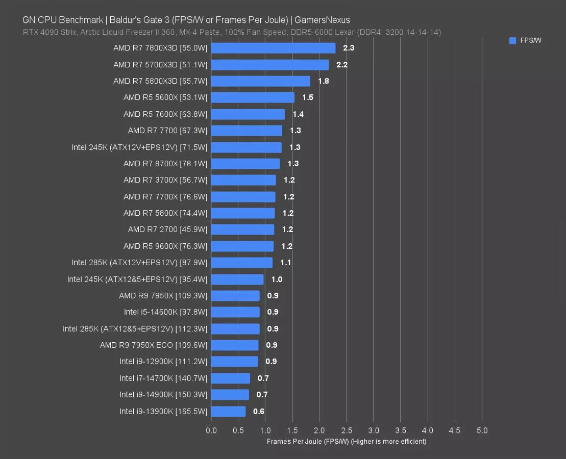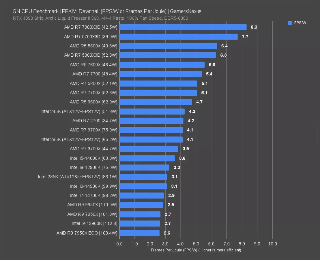 The 5800X3D has a substantial framerate lead and runs at only 65.7W, giving it a 1.8 FPS/W result at 38.5% more efficient than the 245K. The 5700X3D has a larger lead with its 51.1W result and is also typically cheaper, though on an old platform now with old I/O support. Still, it’s impressive.