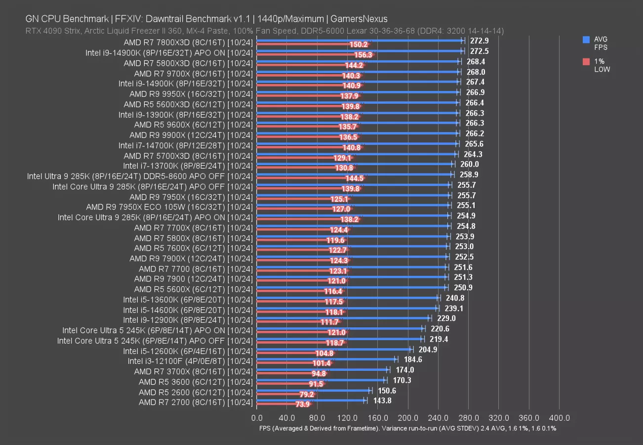 Final Fantasy 14: Dawntrail is up now. At 1080p, the 245K ran at 220 FPS AVG. This allowed the 9700X a staggering lead of 41% for a similar price. The 7700X is cheaper than the 245K, at $280 at the time of writing, and produces a 265 FPS AVG result.