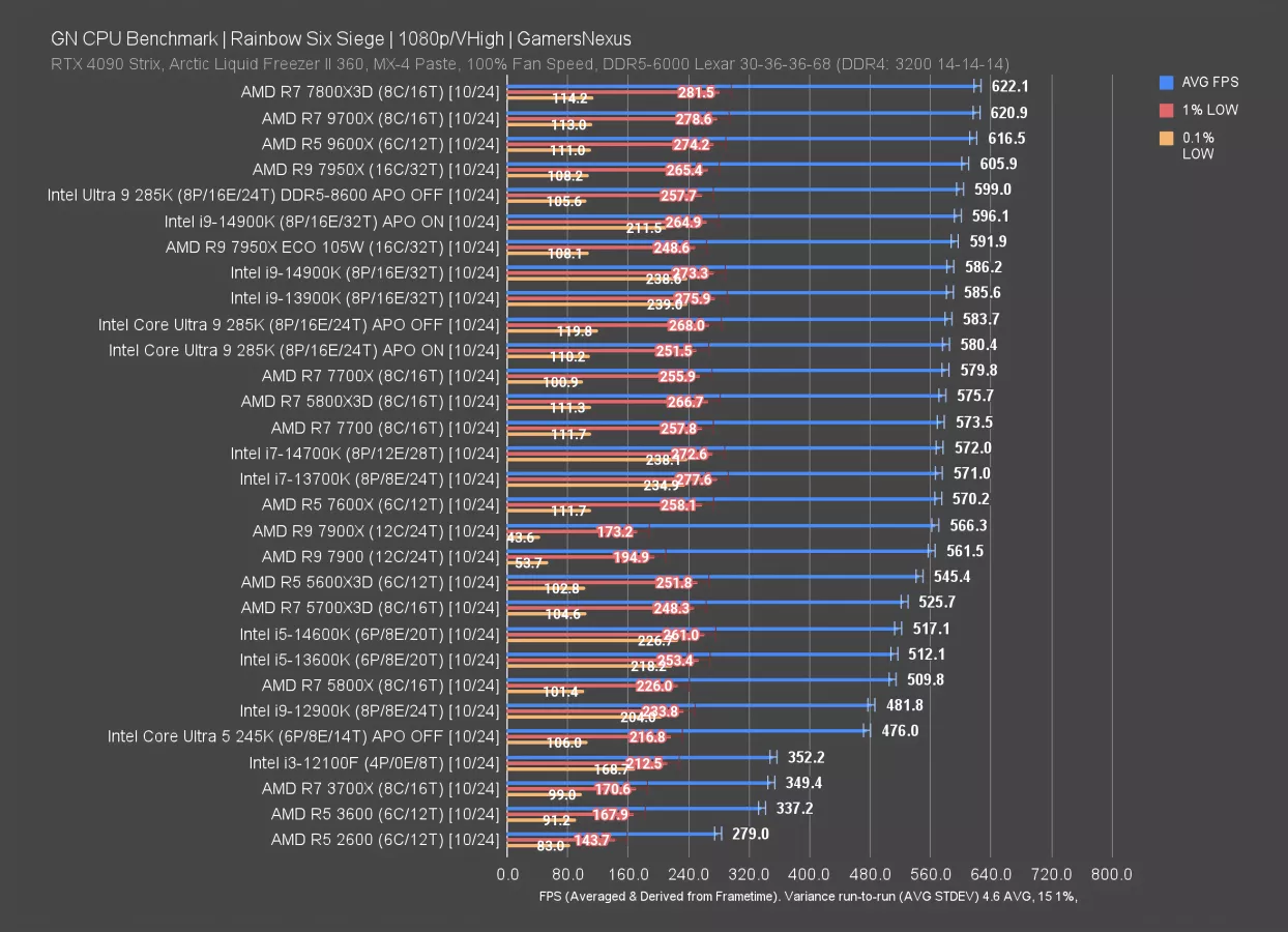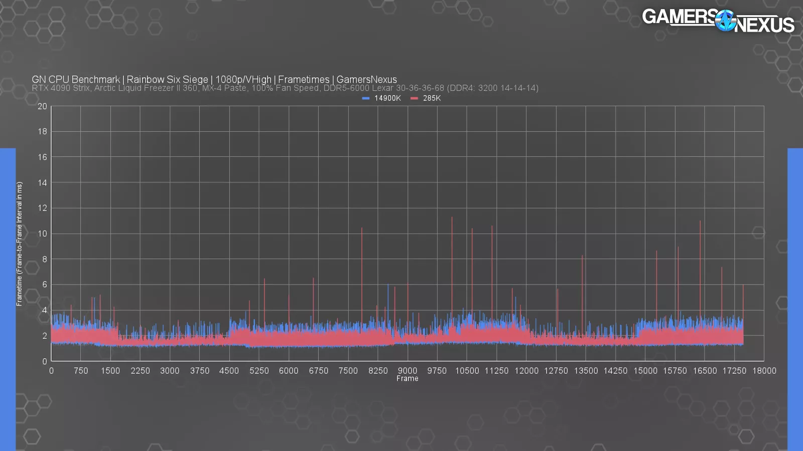 Rainbow Six Siege is next. In the 285K review, we showed the above frametime plot -- which we’ll show again here -- to illustrate some behavior where it appears as if frametime pacing is a little more tuned on the 12-14 Series CPUs than most the others we test.