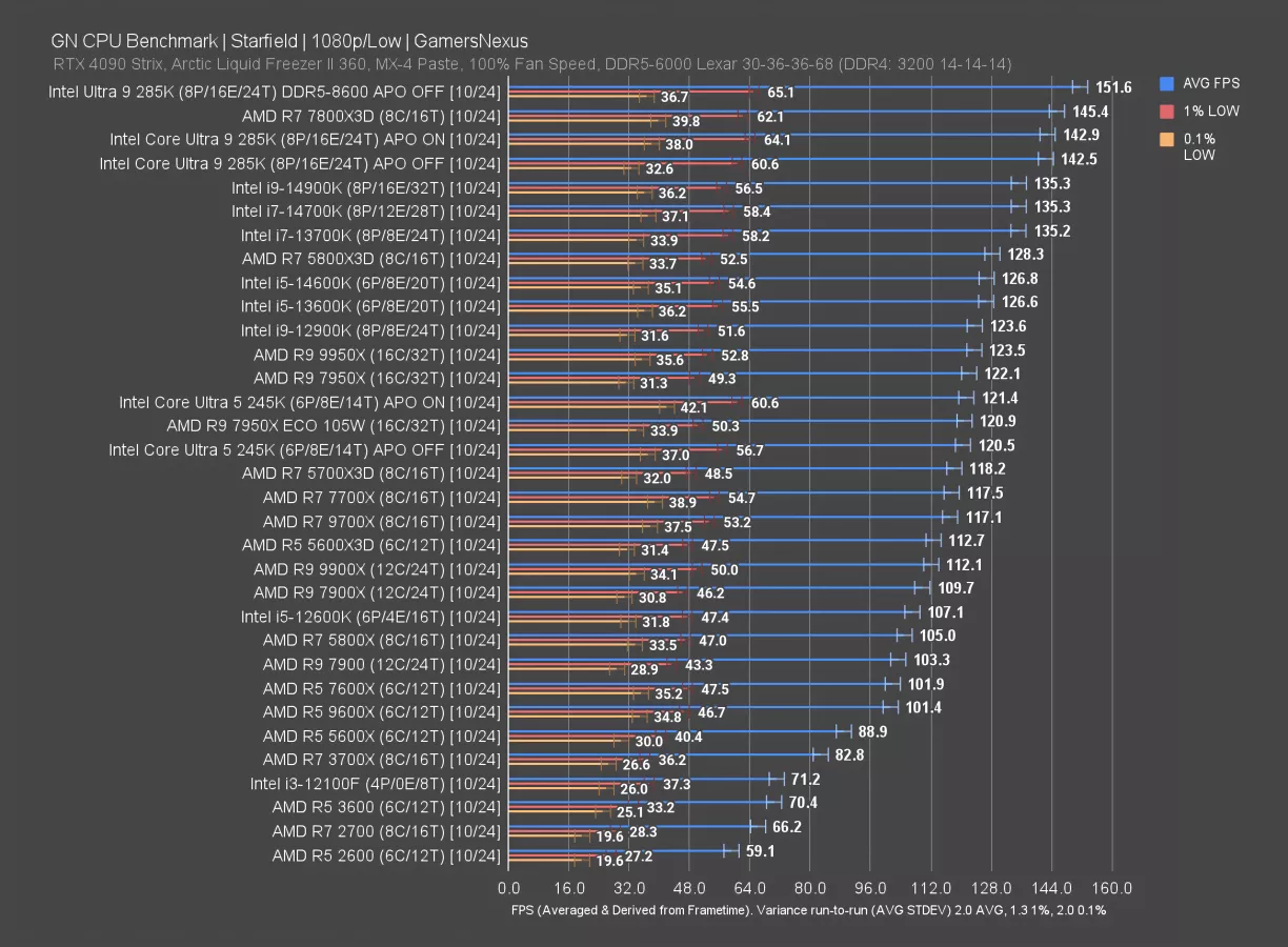 APO actually does something in this game sometimes: We talked about the "exciting" 1.2% gain in the 14900K. The 245K gained 1.8 FPS AVG from APO. Some of that might even not be margin of error. Groundbreaking stuff. That’s almost 0.6%!...